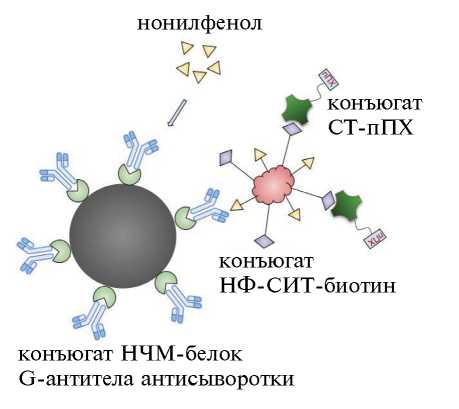 Данные процессы изображены на рис. 1. На магнитных частицах ковалентно иммобилизован белок G, способный взаимодействовать с иммуноглобулинами (IgG) в сыворотке кролика, формируя комплекс МЧ-белок G-IgG. При этом на поверхности магнитных частиц Fab фрагмент антител оказывается открытым и доступным для взаимодействия для конкурентов – свободного НФ и конъюгата НФ-СИТ-биотин. Если НФ присутствует в пробе, он взаимодействует с антителами, занимая центры связывания. Если НФ отсутствует, то конъюгат НФ-СИТ-биотин связывается с антителом. На следующей стадии при добавлении конъюгата стрептавидина с полипероксидазой хрена (СТ-пПХ) происходит высокоаффинное связывание биотин-стрептавидин с формированием комплекса состава МЧ-белок G-IgG-НФ-СИТ-биотин-СТ-пПХ. Наличие пероксидазной метки обеспечивает окисление субстрата (ТМБ) в присутствии пероксида водорода с получением окрашенного продукта.