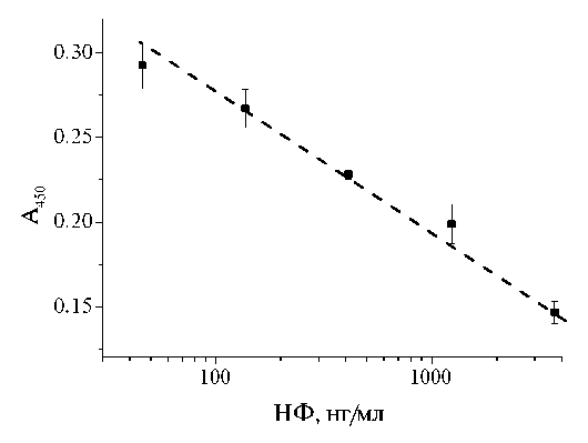 Конкурентный иммуноферментный анализ НФ с использованием МЧ. В пробирки Эппендорф вносили растворы НФ в концентрациях от 200 нг/мл до 0/78 нг/мл в 500 мкл смеси метанол : вода (1 : 4), после чего добавляли иммуносорбент на основе МЧ (конечная концентрация 28 мкг/мл) и инкубировали 15 мин. Иммуносорбент трехкратно отмывали ФБСТ с 0.1% БСА с использованием внешнего магнита. Далее добавляли конъюгат НФ-СИТ-биотин (5 мкг/мл), инкубировали 15 мин и повторяли отмывку. Затем в полученные растворы вносили конъюгат стрептавидина с полипероксидазой (1 : 1000), инкубировали еще 10 мин и проводили отмывку, как описано выше. На конечном этапе в пробирки вносили 100 мкл субстрата на основе ТМБ, через 15 минут осаждали МЧ с помощью внешнего магнита, отбирали надосадок, переносили его в лунки микропланшета и останавливали реакцию добавлением 50 мкл 0.1 М H2SO4.