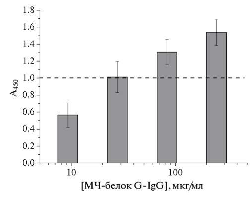 На следующем этапе определяли оптимальную концентрацию иммуносорбента на основе МЧ. Для этого регистрировали взаимодействие полученного препарата в концентрациях от 250 до 9 мкг/мл с поликлональными антителами козы против иммуноглобулинов кролика, меченными пероксидазой хрена. На рис. 7 представлена зависимость оптической плотности при 450 нм от концентрации МЧ. Была выбрана концентрация иммуносорбента, соответствующая ОП 1.0 (совпадающей с традиционным ИФА), которая составила 28 мкг/мл.
