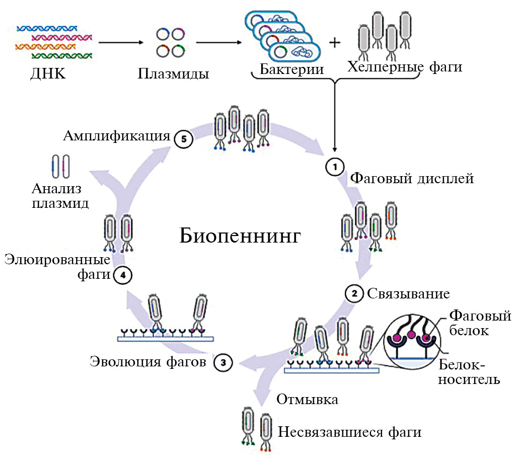 Метод фагового дисплея – эффективный метод выделения моноклональных антител с высокой аффинностью к целевой молекуле. Метод фагового дисплея основан на манипуляциях с генами покровных белков нитевидных фагов – в основном M13 и Fd. Антитела, полученные с помощью фагового дисплея, проходят несколько этапов отбора по аффинности и могут использоваться в качестве селективных рецепторов в биосенсорах [29]. Показано, что фаговые библиотеки представляют собой богатый источник фрагментов антител, связывающихся с белковыми и гликопротеиновыма антигенами с наномолярным сродством и высокой специфичностью. Поэтому фаговые антитела используются в диагностике из-за их специфичности и аффинности. Многие платформы, такие как ммунохроматографический анализ, ИФА и иммунофлуоресценция, позволяют быстро и точно идентифицировать целевые антигены, обнаруженные в образце [29].