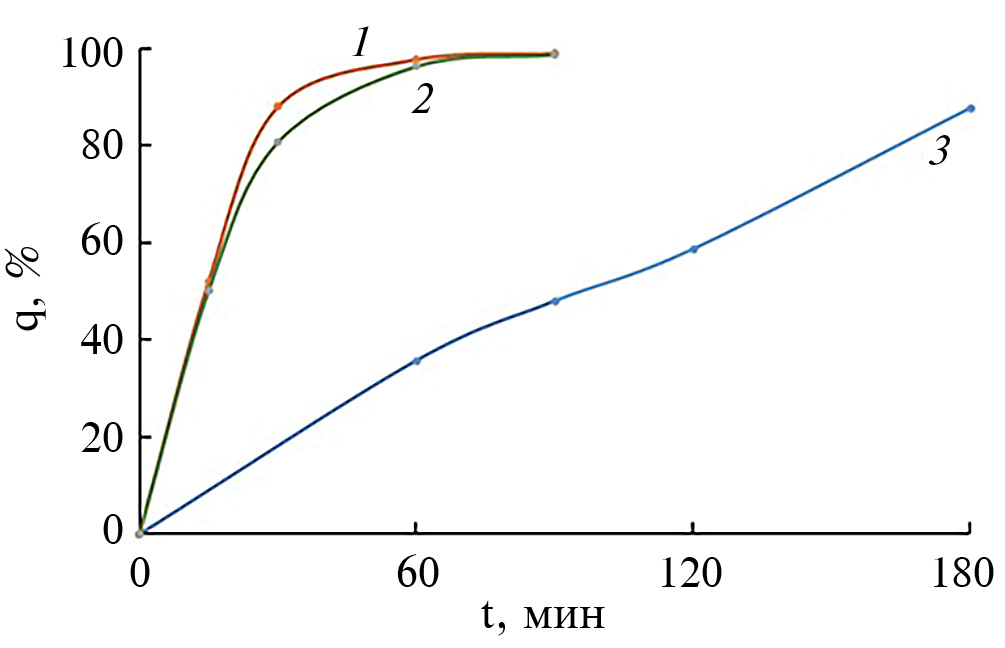 Рис. 1. Конверсия ВП в процессе привитой полимеризации: в водном растворе при 70°C, инициатор – церий нитрат аммония (1); в водном растворе при 70°C, инициатор – персульфат аммония (2) и в растворе ДМСО при 70°C, инициатор – церий нитрат аммония (3).