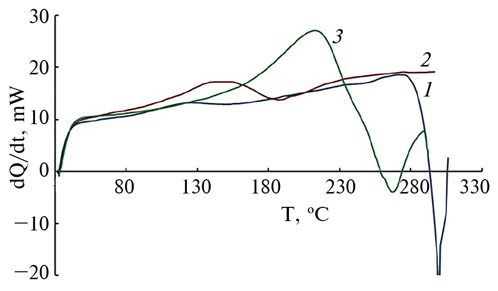 Рис. 5. Кривые, полученные методом ДСК: 1 – хитозан; 2 – ПВП; 3 –хитозан-прив-ПВП.