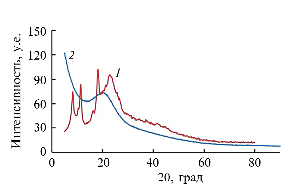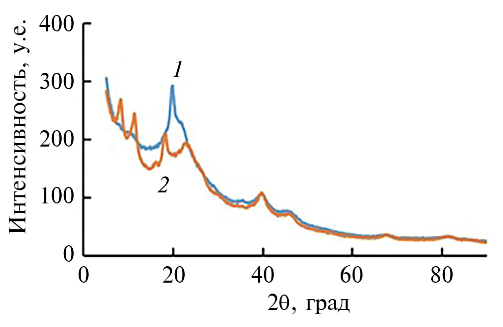 Рис. 6. РФА-спектр хитозана (1) и хитозан-прив-ПВП (2).