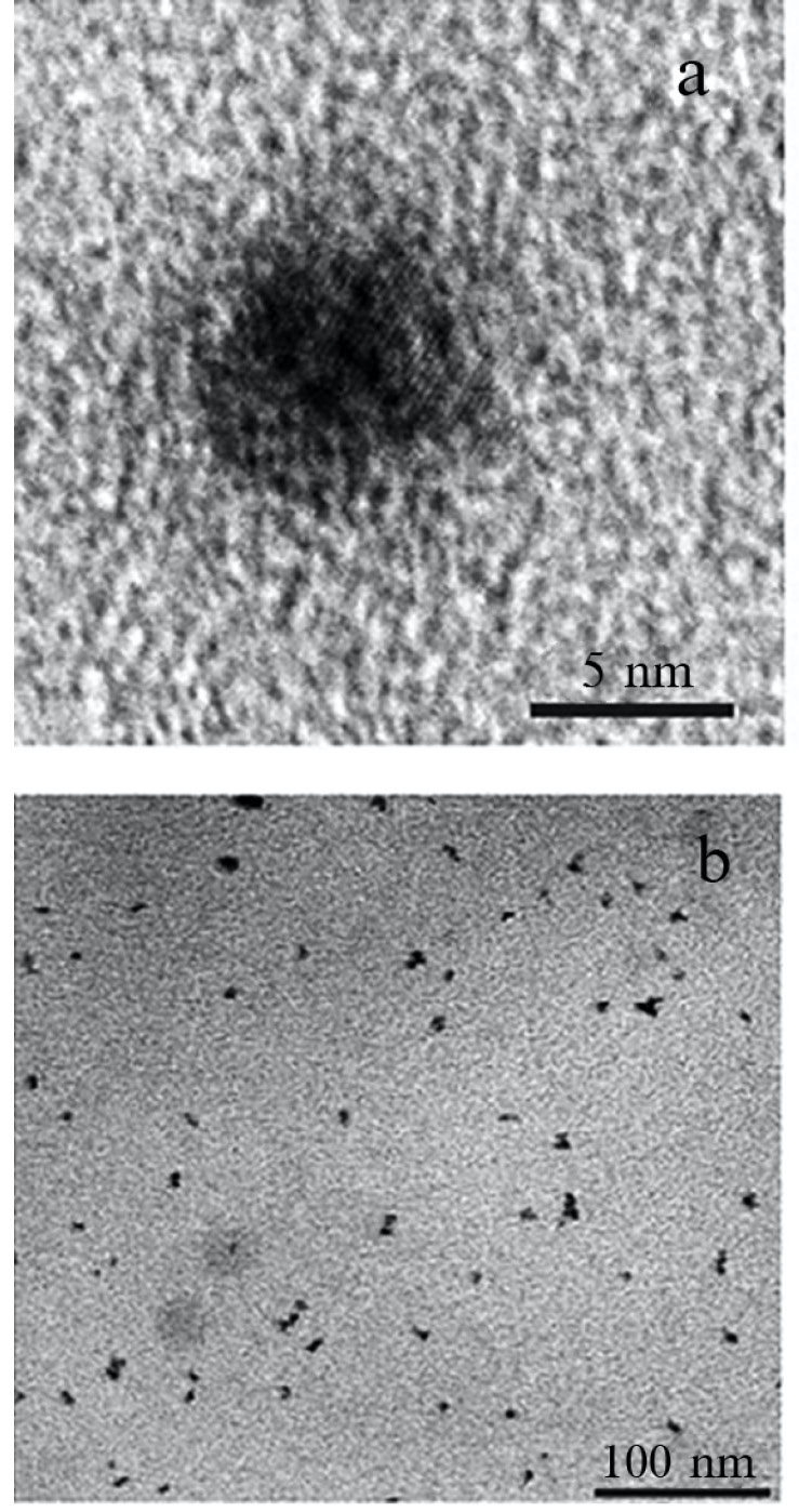 На микрофотографиях ПЭМ отчетливо видно, что большинство НЧ платины образуют агломераты, состоящие из нескольких десятков НЧ (рис. 9б). При этом отдельные НЧ платины характеризуются кристаллической структурой и средним диаметром около 1.6–5.0 нм НЧ (рис. 9а).