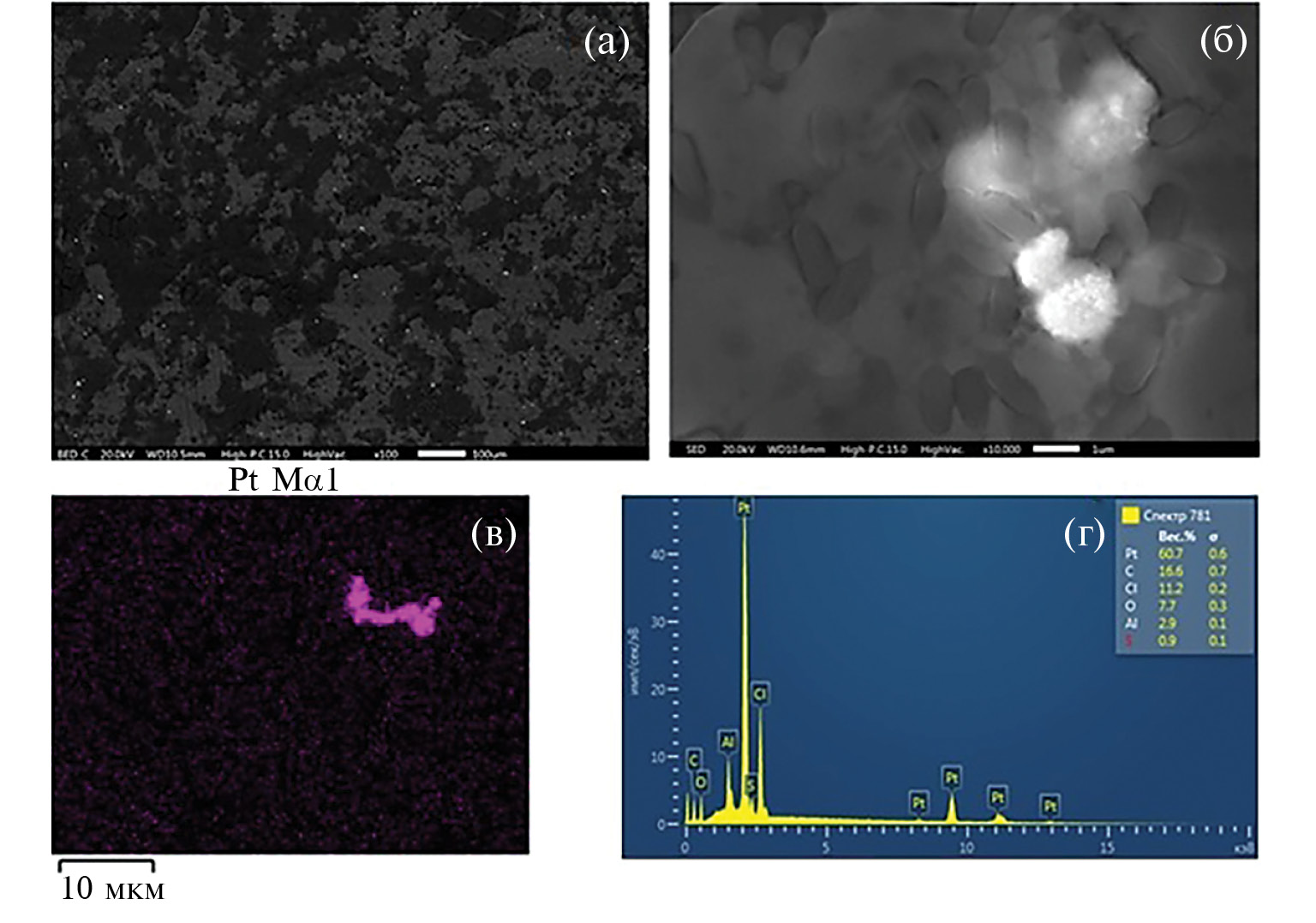 Рис. 10. Изображения поверхности композита, полученные методом СЭМ. Световые точки (а, б, в) относятся к НЧ платины, на диаграмме (г) продемонстрированно распределение элементов в точке изображения (в), относящейся к агломератам НЧ.