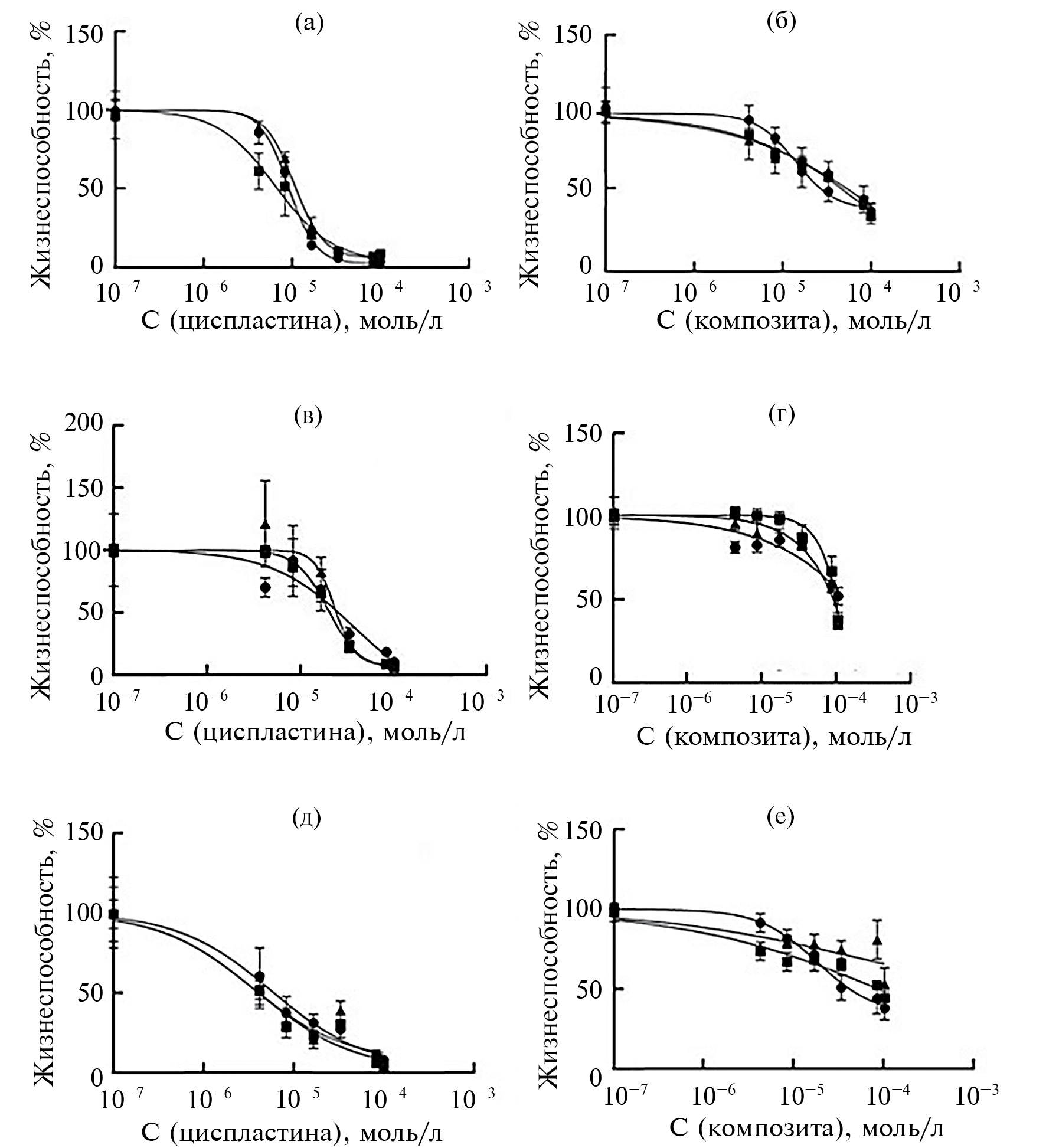 Рис. 11. Жизнеспособность (%) раковых клеток линии HeLa Kyoto (а, б), клеток линии A431 (в, г) и клеток фибробластов линии hTERT BJ-5TA (д, е) при воздействии – цисплатина (а, в, д), композита НЧ Pt с сополимером (б, г, е).