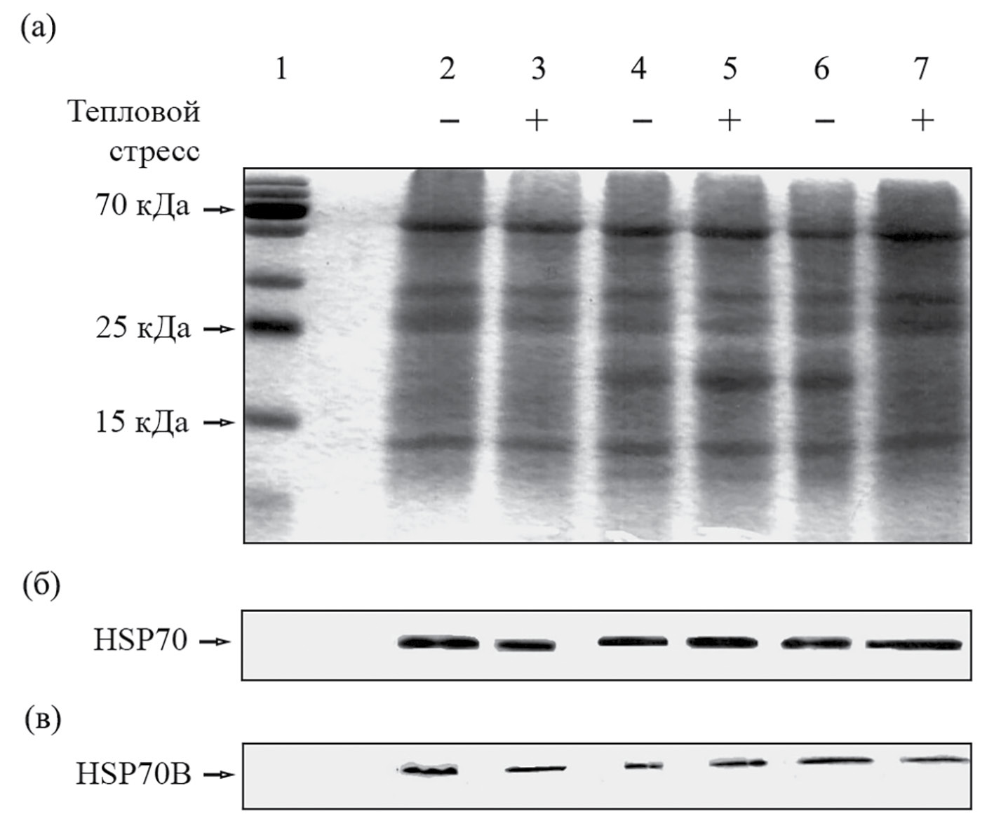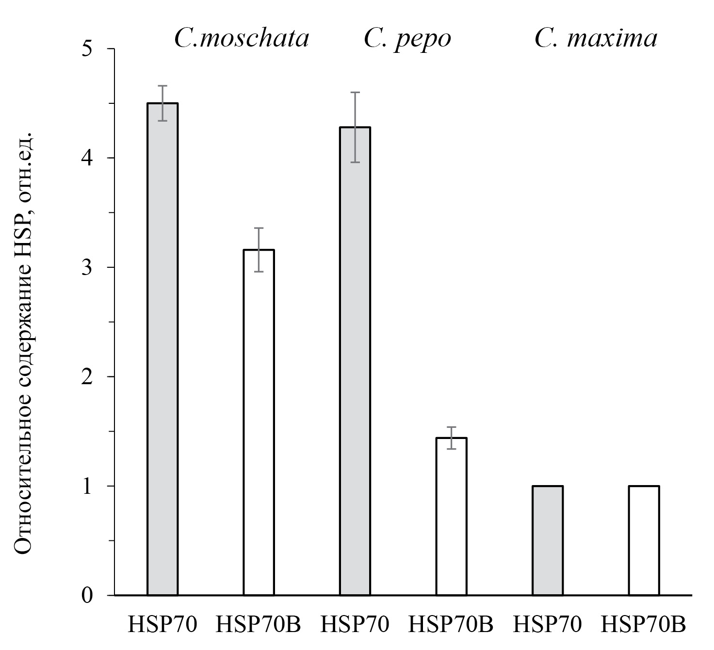 В результате воздействия повышенных температур на растения тыквы вида C. moschata, было выявлено снижение уровней HSP70 и HSP70В по сравнению с необработанными растениями, что указывло не только на низкую способность противостоять стрессу, но и на начавшиеся в клетках деструктивные процессы. Не исключено, что избыточная конститутивная экспрессия генов HSP70 у C. moschata могла также приводить к подавлению синтеза новых HSP или некоторых других белков теплового стресса, как это ранее было показано для клеток экстремальных психрофилов [15].