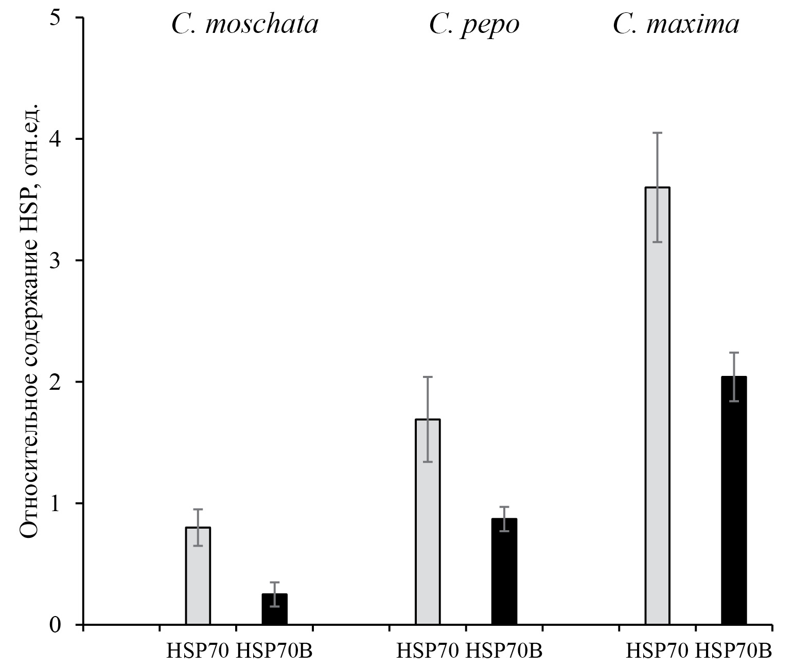 Определение уровня шаперонов HSP70 цитоплазмы и HSP70В хлоропластов в растениях, не подвергавшихся тепловому стрессу, показало более высокий конститутивный уровень HSP70 у тыкв С. moschata и C. рepo по сравнению C. maxima. Наименьший конститутивный уровень белков теплового шока цитоплазмы HSP70 и хлоропластов HSP70В обнаружен у вида C. maxima и был принят за единицу (рис. 3). Как следует из рисунка конститутивные уровни HSP70 цитоплазмы и HSP70В хлоропластов у тыквы C. moschata в 4.5 и 2 раза выше, а у тыквы C. pepo в 4.3 раза и в 1.5 раза выше по сравнению с тыквой C. maxima соответственно (рис. 3).