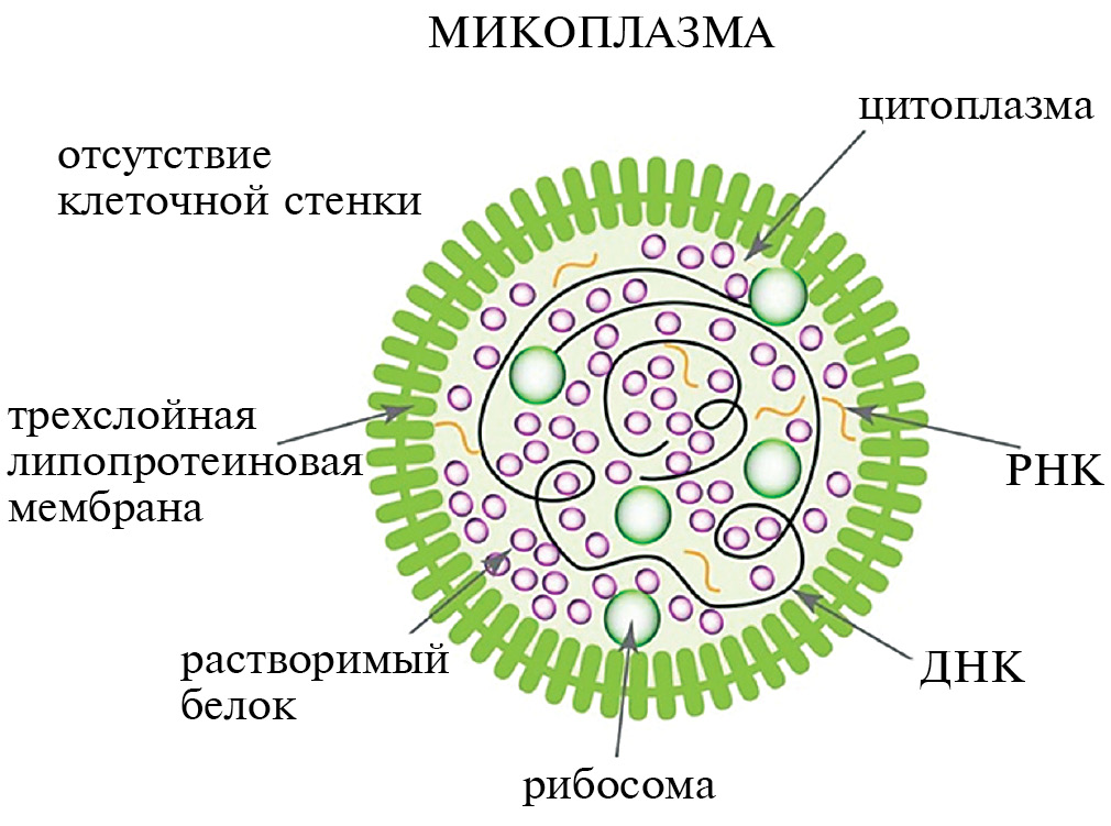 Рис. 1. Структурная схема микоплазмы. Показано наличие липопротеиновой мембраны с растворимым содержимым в виде белков, РНК, ДНК и отсутствие клеточной стенки и ядерной оболочки [18].
