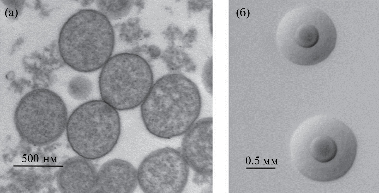 Рис 2. (а) Трансмиссионная электронная микроскопия Mycoplasma agalactiae: видны клетки с ровными очертаниями и микоплазма в виде неровных пятен [41]. (б) Колонии микоплазм на агаре: типичная форма яичницы на плотных средах, видна верхушечная структура, с помощью которой микоплазмы прикрепляются к клетке-хозяину.