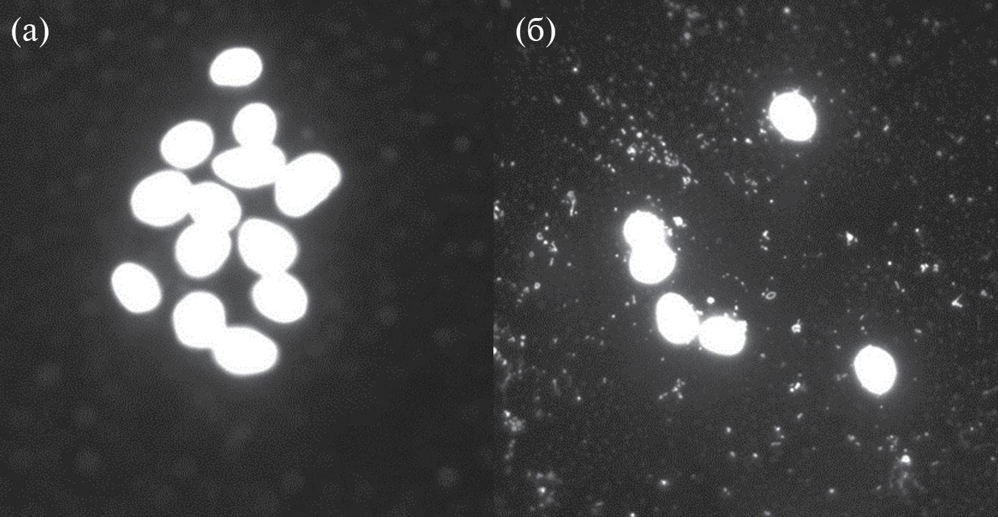 Рис 3. Окрашивание культуры клеток Hoechst 33258 [42]. Образец инкубировали в течение 3-х суток с чистой индикаторной культурой, клетки фиксировали, окрашивали Hoechst 33258 и наблюдали во флюоресцентном микроскопе (×40): (а) культура клеток Vero без микоплазмы; (б) видны округлые ядра клеток Vero и микоплазма в виде отдельных мелких иерархичных пятен.