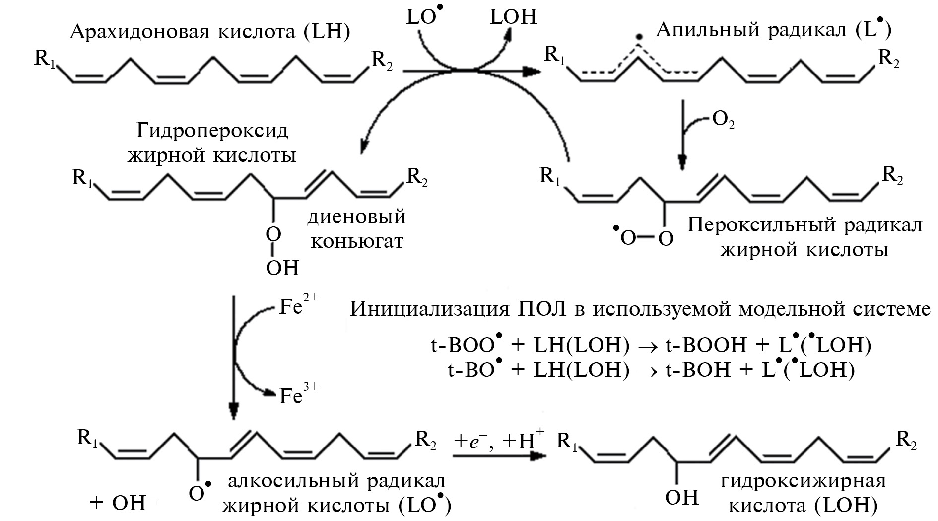 где LO• – алкоксильный радикал липида, LOO• – пероксильный радикал липида, LONO и LONO2 – нитролипиды, LOONO – органический пероксинитрит.