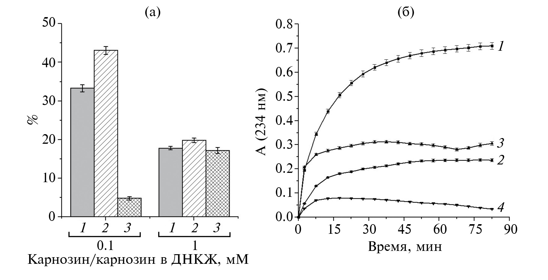 Рис. 5. Образование диеновых конъюгатов в ходе окисления арахидоновой кислоты (3.3 мМ) в системе metMb― t-BOOH: а – влияние различных концентраций карнозина (1), карнозина + Fe2+ (2) и карнозиновых ДНКЖ (3) на уровень диеновых конъюгатов, образовавшихся за 80 мин реакции (за 100 % принимали уровень в контроле); б – кинетики накопления диеновых конъюгатов в смеси с карнозином, карнозиновыми ДНКЖ и Fe2+; контроль, смесь без добавок (1), с добавлением: карнозина (2), FeSO4 (3), карнозиновых ДНКЖ (4).
