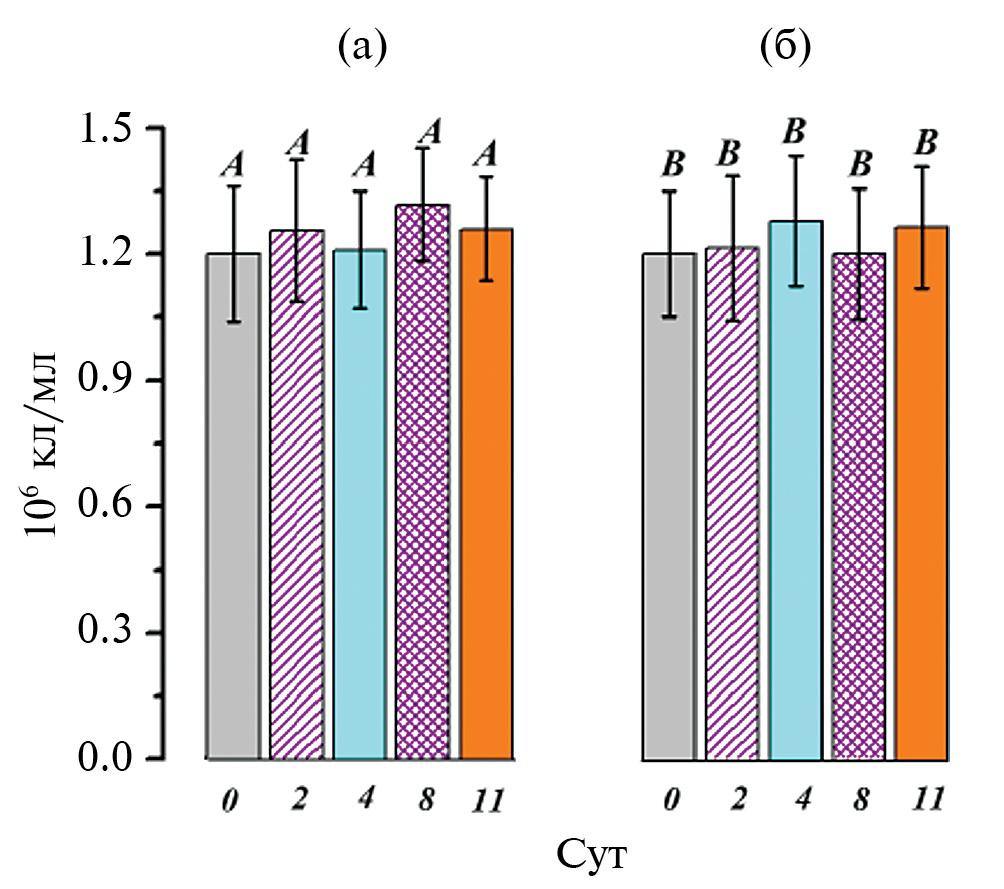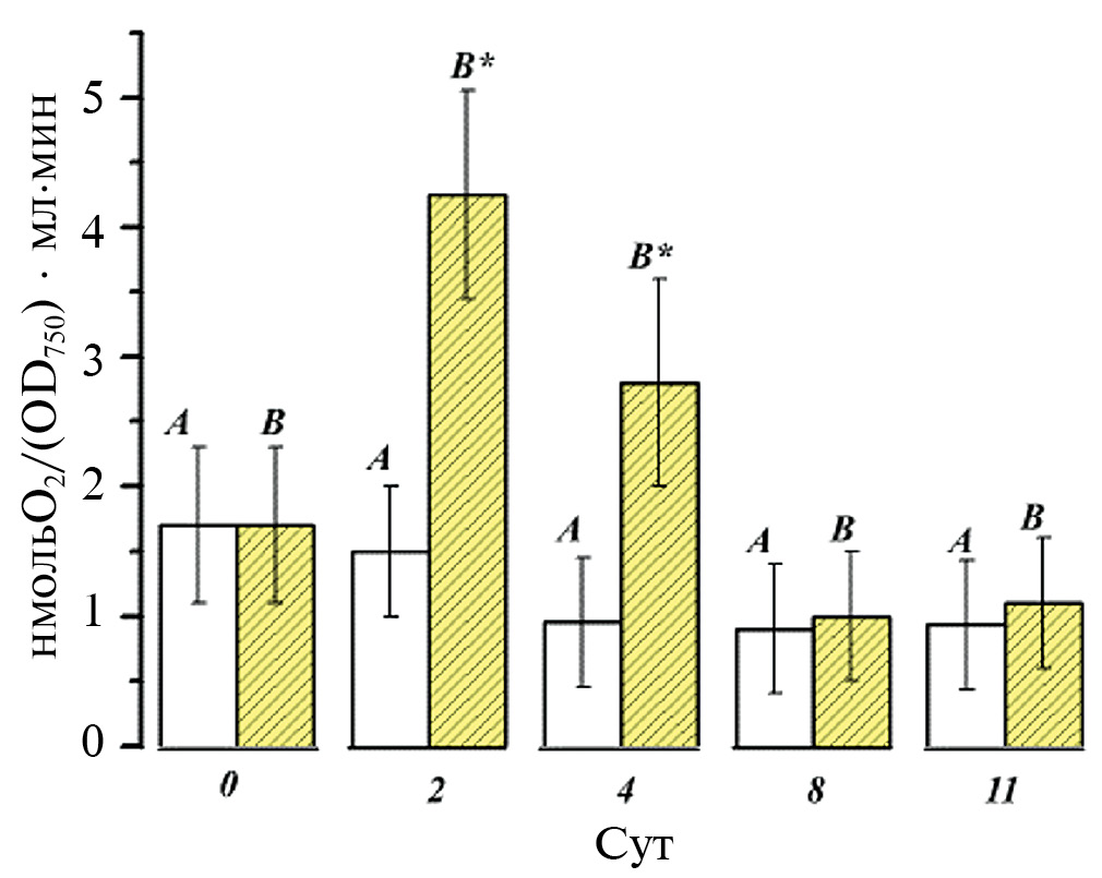 В присутствии этанола лаг-фаза (столбцы В) занимала столько же времени, сколько при фотоавтотрофии. Достоверное опережение в росте по сравнению с фотоавтотрофной культурой (В* > А*) прослеживалось в последние дни опыта. К окончанию эксперимента, на 11 сут, численность “этанольных” клеток превышала накапливаемую при фотоавтотрофии в 1.7 раза, что могло указывать на усвоение этанола на свету. Необходимо отметить, что при использовании также 0.1%-ного этанола в среде для зеленой микроводоросли Haematococcus pluvialis было получено почти такое же увеличение биомассы: в среднем в два раза [29].