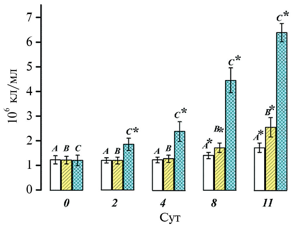 Рис. 3. Динамика роста культуры G. sulphuraria на свету в течение 11 сут без добавок (А, фотоавтотрофная культура), в присутствии 0.1% этанола (В) и в присутствии 0.1% глюкозы (С). Приведены средние значения и доверительные интервалы (n = 3). Совпадение буквенных обозначений в каждой серии означает отсутствие статистически значимых различий; * Обозначены статистически значимые различия.