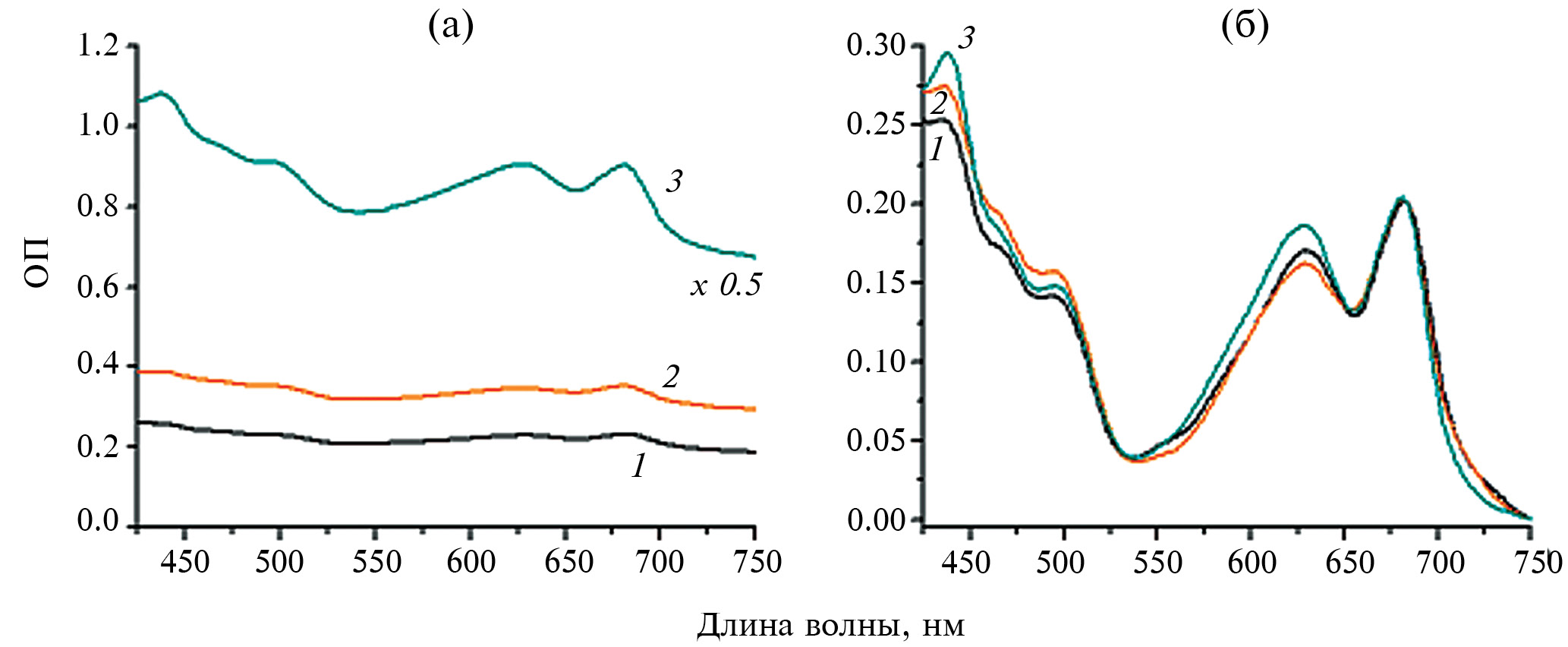 Рис. 4. Спектры поглощения культуры клеток G. sulphuraria на 11 сут роста на свету (а), и те же спектры после вычитания вклада, даваемого светорассеянием, и нормирования в максимуме поглощения хлорофилла (б): 1 – фотоавтотрофная культура; 2 – фотогетеротрофная культура, содержащая 0.1% этанола; 3 – фотогетеротрофная культура, содержащая 0.1% глюкозы (ординаты спектра 3 при 750 нм уменьшены вдвое) .