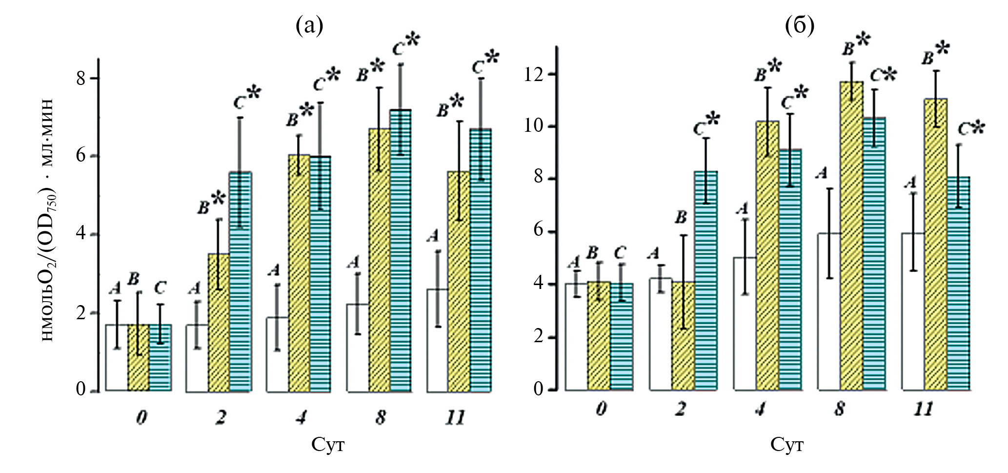 Определение скорости фотосинтетического выделения кислорода в фотоавтотрофной культуре показало, что, судя по средним значениям, происходило ее увеличение, но согласно доверительным интервалам, это увеличение нельзя считать достоверным. В сравнении с фотоавтотрофией усиление фотосинтеза при добавлении этанола и глюкозы (рис. 5б) было достоверным и весьма заметным (В* и С* > А). По всей вероятности, резкое возрастание скорости дыхания в начале лаг-фазы в присутствии этанола сопровождалось ускоренным образованием углекислого газа, который используется в качестве конечного акцептора фотосинтеза и ускоряет этот процесс.