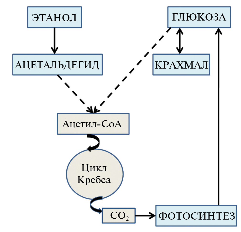 Наиболее вероятной причиной возможного потребления этанола на свету после периода адаптации к вызванному им стрессу является световая активация АДГ и ацетальдегиддегидрогеназы как ферментов, отвечающих за усвоение этанола при поступлении в клетку. Потребление этанола, выгодное энергетически, одновременно приводит к снижению внутриклеточной концентрации и стрессового воздействия этанола.