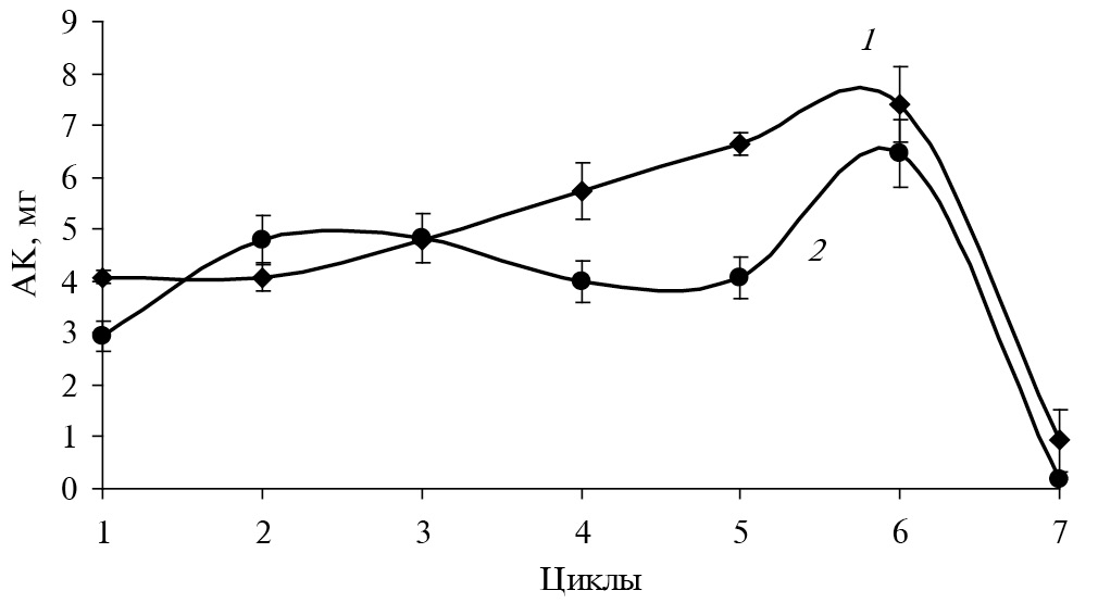 Примечание: 1 – контроль (иммобилизованные клетки без АА), 2 – иммобилизованные клетки с АА.
