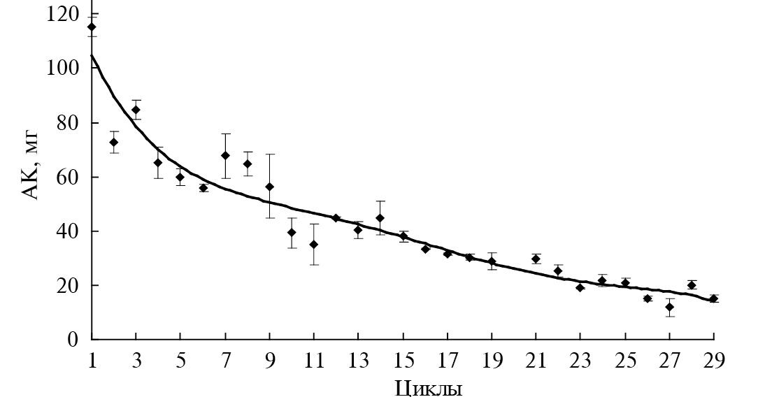 Определено количество АК, образующейся при проведении последовательных циклов трансформации АА биокатализаторами на основе биопленок R. erythropolis 4-1, R. erythropolis 11-2 и A. faecalis 2. Установлено, что амидазная активность биопленок R. erythropolis 11-2 и A. faecalis 2 на ТРГ сохранялась на протяжении 30 проведенных циклов, а R. erythropolis 4-1 – 5 циклов. Показано, что наибольшее количество АК образовывалось при трансформации АА биокатализатором на основе биопленок R. erythropolis 11-2 на 0.5 г ТРГ – 100–120 мг (рис. 3), а биокатализатором на основе A. faecalis 2 – 80–100 мг (рис. 4). Наименьшее количество кислоты (1–3 мг) продуцировали биопленки R. erythropolis 4-1.