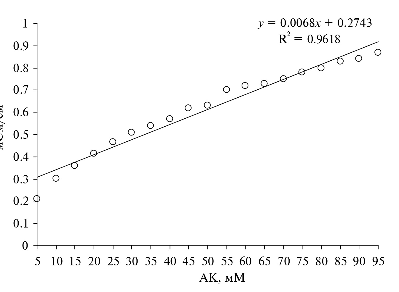 Разработка прототипа кондуктометрического биосенсора на акриламид. В работе предложен принцип биодетекции АА, основанный на определении электропроводности раствора при трансформации АА в АК иммобилизованными бактериальными клетками с амидазной активностью. Образующаяся в процессе биохимической реакции АК изменяла электропроводность раствора, тогда как АА не обладал таким свойством. Определенные показатели электропроводности растворов АК представлены на рис. 5. На основании аппроксимации экспериментальных точек с использованием программного пакета Microsoft Excel 2010 получено уравнение (1), позволяющее определить концентрацию акриловой кислоты в растворе: