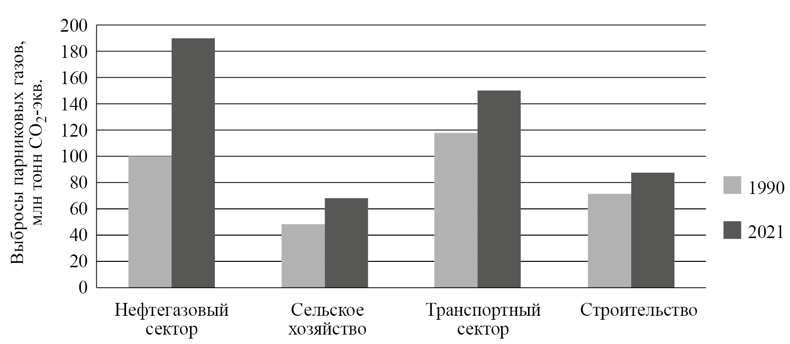 C 1990 по 2021 гг. в ряде отраслей возрастали выбросы парниковых газов: в нефтегазовой (на 88%), сельскохозяйственной (на 39%), транспортной (на 27%) и строительной (на 21%) (рис. 2).
