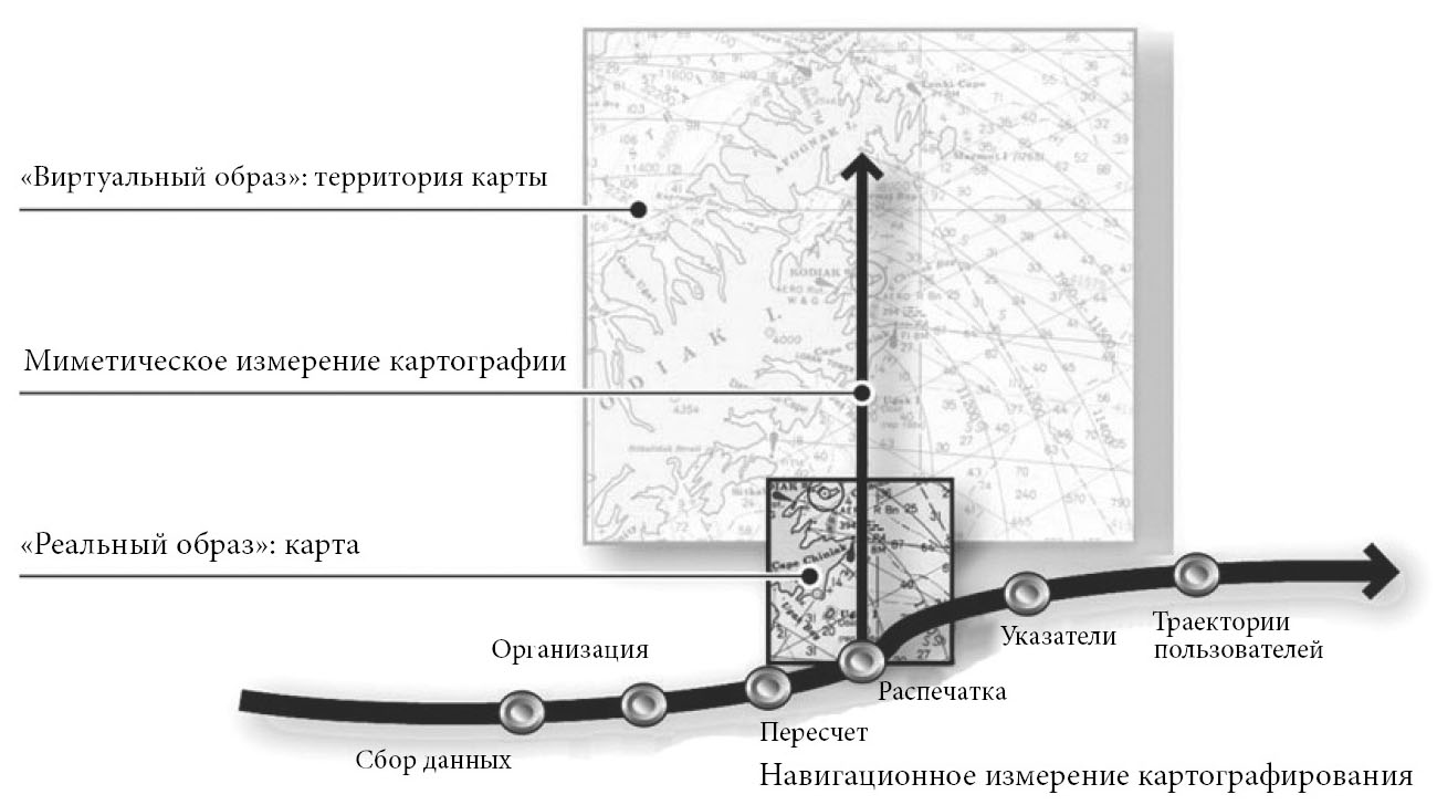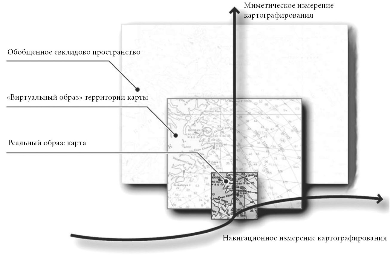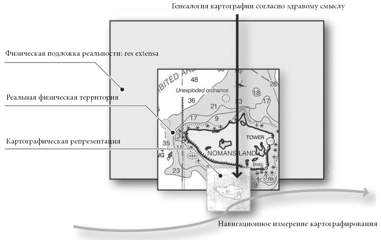 Наш главный аргумент состоит в том, что это второе, миметическое, измерение скорее паразитировало на первом, навигационном, и эта паразитическая интерпретация создала «виртуальный мир» «территории», которую следует понимать не как то, что было запечатлено картой, а как тупик, втягивающий карту в судьбу, для которой ее никогда не создавали и которую она никогда не сможет исполнить45.