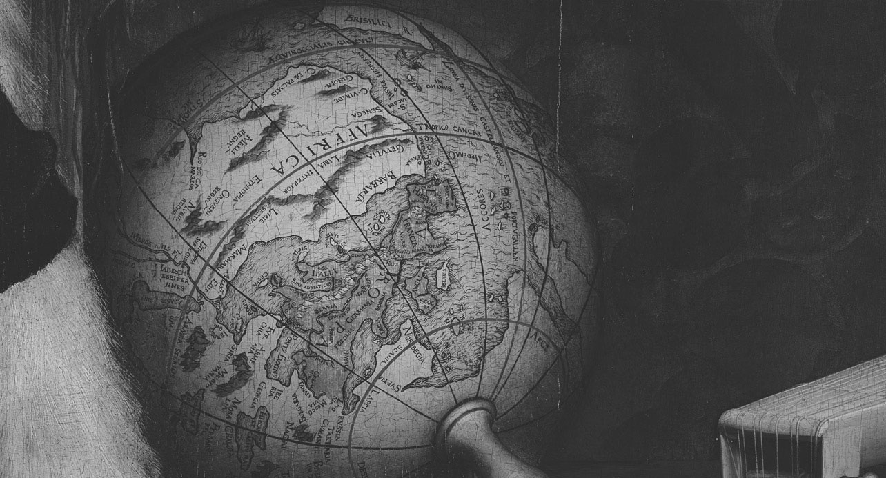 Единственные иконографические элементы, которые мы видим на глобусе Гольбейна — это два корабля. Мы можем позволить себе исторически обоснованную фантазию: это две португальские каравеллы. Одна из них направляется к мысу Доброй Надежды, чтобы, обогнув его, добраться по Индийскому океану до португальских факторий в Каликуте, Малакке или на Молуккских островах. Вторая каравелла возвращается с грузом пряностей в Европу.