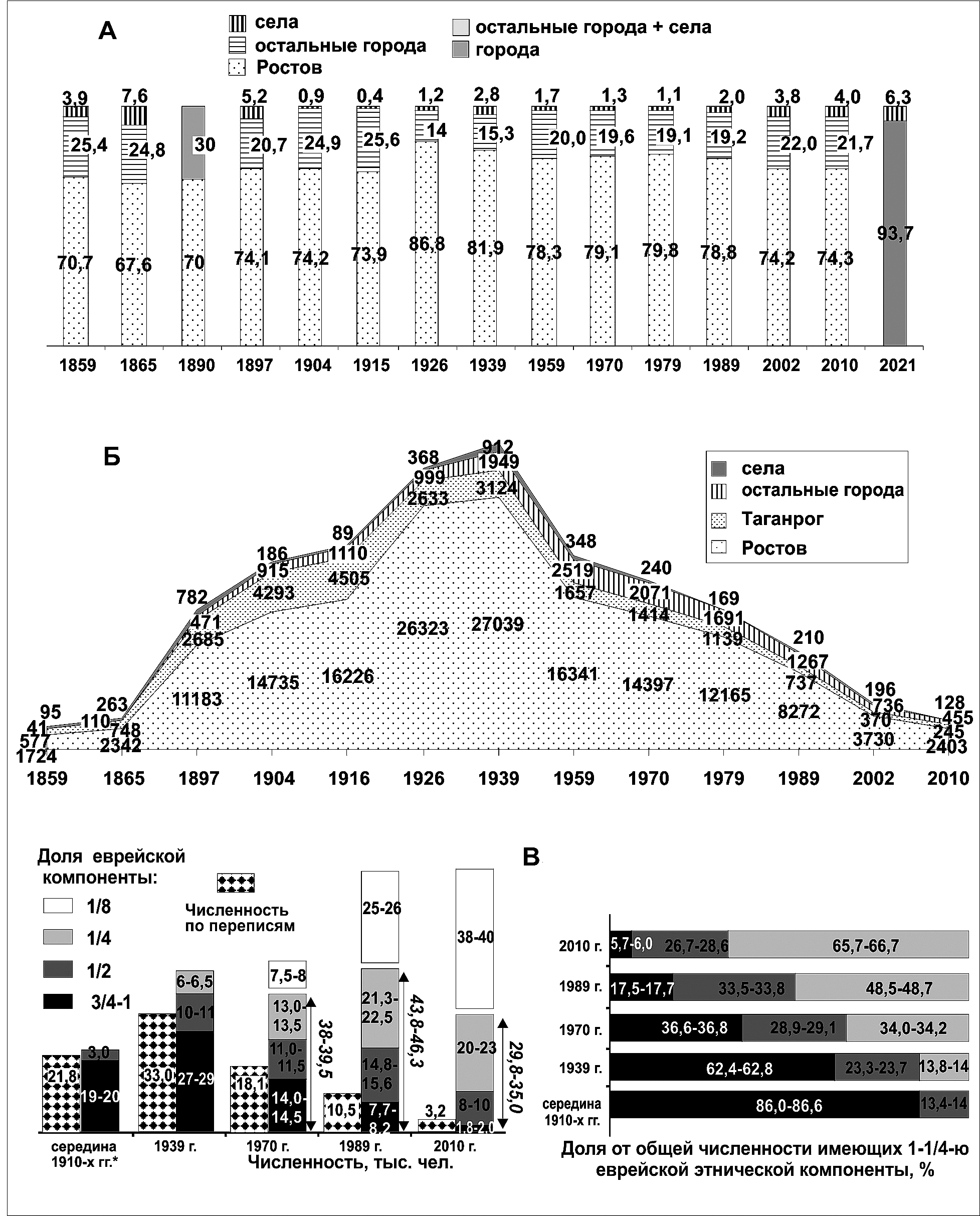 А. Доля в еврейском населении Дона (%) (Рассчитано по: Города России 1904; Отчеты 1880–1916; Памятная книжка ЕГ 1860, 1867; Перепись 1897; Всесоюзные переписи 1926–1989; Всероссийские переписи 2002–2021). Б. Численность евреев Дона (чел.) (Рассчитано по: Города России 1904; Отчеты 1880–1916; Памятная книжка ЕГ 1860, 1867; Перепись 1897; Всесоюзные переписи 1926–1989; Всероссийские переписи 2002–2021). В. Динамика численности евреев Дона и населения с еврейскими корнями, середина 1910-х – 2010-е годы (тыс. чел., %) (Расчеты автора)