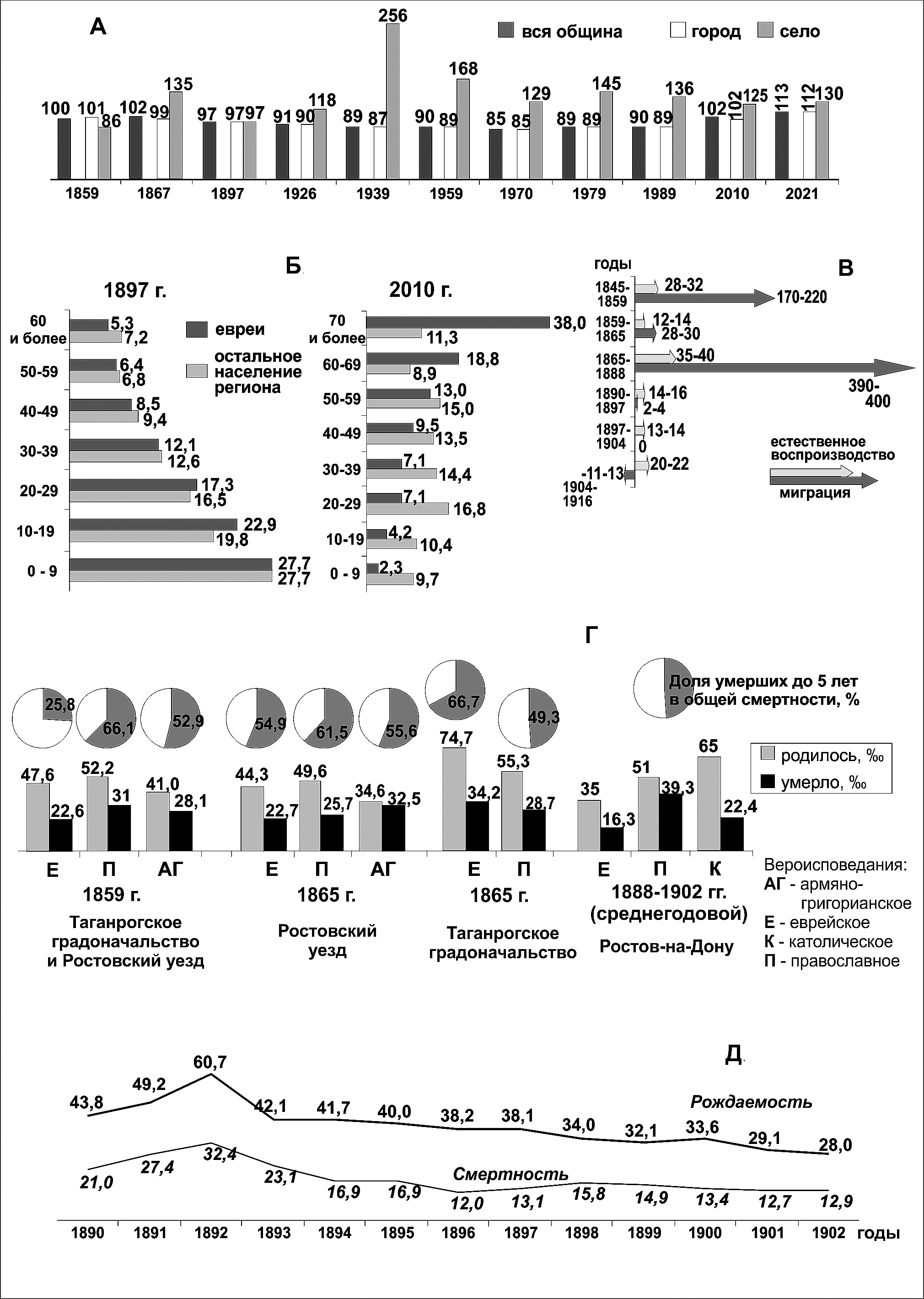 А. Гендерное соотношение у еврейского населения Дона (число мужчин на 100 женщин) (чел.) (Рассчитано по: Памятная книжка ЕГ 1860, 1867; Перепись 1897; Всесоюзные переписи 1926–1989; Всероссийские переписи 2002–2021). Б. Возрастная структура (%) (Рассчитано по: Гонтмахер 1999; Перепись 1897; Всесоюзные переписи 1926–1989; Всероссийские переписи 2002–2021). В. Компоненты демографической динамики общины Дона, 1845–1916 гг. (%) (Рассчитано по: Гонтмахер 1999; Отчеты 1890–1916; Памятная книжка ЕГ 1860, 1867; Перепись 1897; Всесоюзные переписи 1926–1989; Всероссийские переписи 2002–2021). Г. Воспроизводственные показатели представителей различных этноконфессиональных групп Нижнего Подонья, 1850–1900-е годы. (Рассчитано по: Памятная книжка ЕГ 1860, 1867; Памятная книжка Таганрогского 1865: 26–28; Смирнов 1905: 7–8, 44–45). Д. Воспроизводственные показатели еврейского населения Ростова-на-Дону, 1890–1902 гг. (‰) (Рассчитано по: Смирнов 1905: 7–8, 19, 44–45)