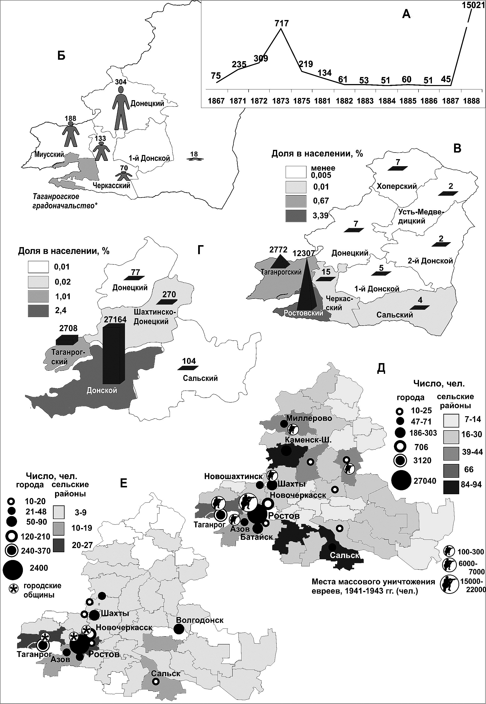 А. Динамика еврейского населения ОВД, 1867–1888 гг. (чел.) (Составлено по: Гонтмахер 1999; Памятные книжки ОВД 1870–1916). Б. Евреи в ОВД, 1873 г. (чел.) (Составлено по: Гонтмахер 1999). В. Евреи в ОВД, 1897 г. (чел., %) (Рассчитано по: Перепись 1897). Г. Евреи в пяти донских округах Северо-Кавказского края, 1926 г. (чел, %) (Рассчитано по: Всесоюзные переписи 1926–1989). Д. Евреи Ростовской области, 1939 г. (чел.) (Рассчитано по: Всесоюзные переписи 1926–1989; Войтенко 2005; Мовшович 2002). Е. Евреи Ростовской области, 2010 г. (чел.)