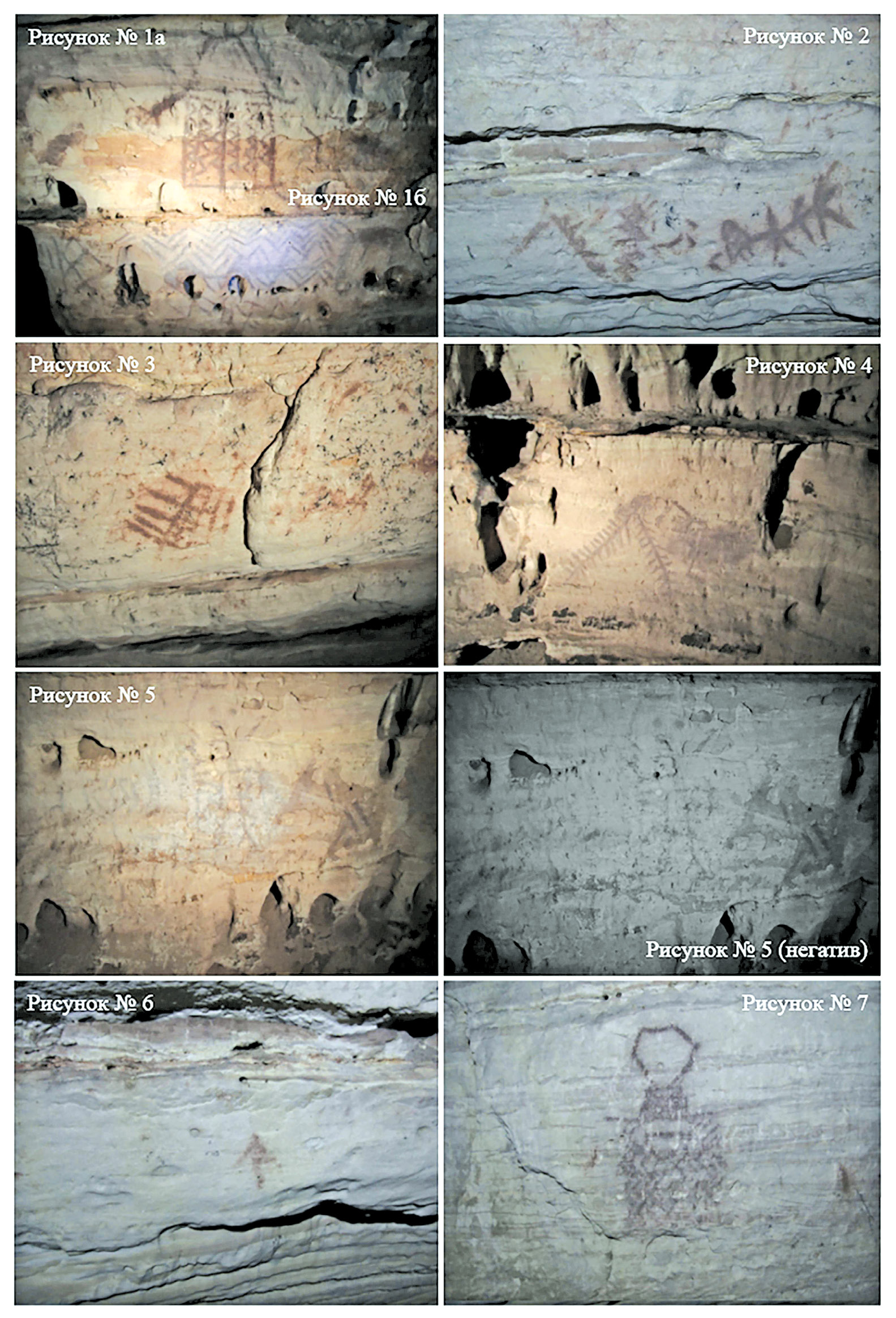 Рисунок № 1, или 1а и 1б (изобразительная композиция) (см. Фото 2). Расположен в конце центрального коридора на левой стене. Данный рисунок следует трактовать, вероятно, как композицию, в верхней части которой угадывается антропоморфное изображение (Рисунок № 1а), в нижней части – геометрический орнамент (Рисунок № 1б). Расстояние между двумя частями композиции около 15 см (ПМА 2021).