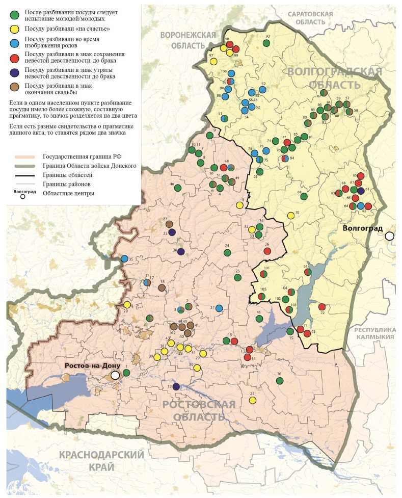 В свадебном обряде восточнославянского населения территории бывшей Области войска Донского “разбивание посуды” обнаруживает целый набор значений, который включает в том или ином виде практически все смыслы этого действия, отмеченные у славян. Варьирование ритуальной семантики данного акта определяется временем и местом совершения, его участниками, дальнейшими манипуляциями с осколками, приговорами и обрядовой лексикой, а также “прагматическими смыслами”, которые “обусловлены отношением к действию его исполнителей, их интенциями и мотивировками совершаемого ритуального акта” (Там же: 94). Пестрота значений “разбивания посуды”, помимо акциональности, обусловлена и особенностями формирования традиционной духовной культуры населения региона – вторичной по отношению к культуре “материнских”, в первую очередь южнорусских территорий, складывавшейся под влиянием образа жизни донских казаков, обычаев соседних неславянских народов, а также малороссийских крестьян, переселявшихся на Дон (Проценко 1998: 80–82). Основным источником изучения разбивания посуды на донской свадьбе стали материалы диалектологических и этнолингвистических экспедиций Южного федерального университета (до 2006 г. – Ростовский государственный университет) в Ростовскую и Волгоградскую области (далее – РО и ВО соответственно) в 1976–2014 гг. (с 2008 г. экспедиции проводились совместно с Южным научным центром РАН), личные архивы полевых материалов ростовских исследователей и автора настоящей статьи, опубликованные полевые материалы и работы по свадебному обряду донских казаков. Было проанализировано более 150 текстов о разбивании посуды на свадьбе из 22 районов РО и 14 районов ВО, территория которых входила до революции в Область войска Донского.