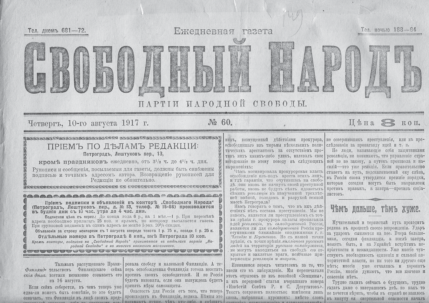 Recently, a small, undeservedly forgotten article by Academician M.I. Rostovtsev was discovered in the newspaper Svobodnyi Narod (Free People) of the Cadet Party (Petrograd) under the title “New System and Science.” It was published in August 1917. Its leitmotif is that only firm state power can guarantee the preservation and development of culture and science in Russia. The weakening of the state as a result of powerful revolutionary upheavals, according to the scientist, is the main danger to the scientific life of the country. This publication is interesting even now, during the difficult period of reforming science and education in modern Russia.