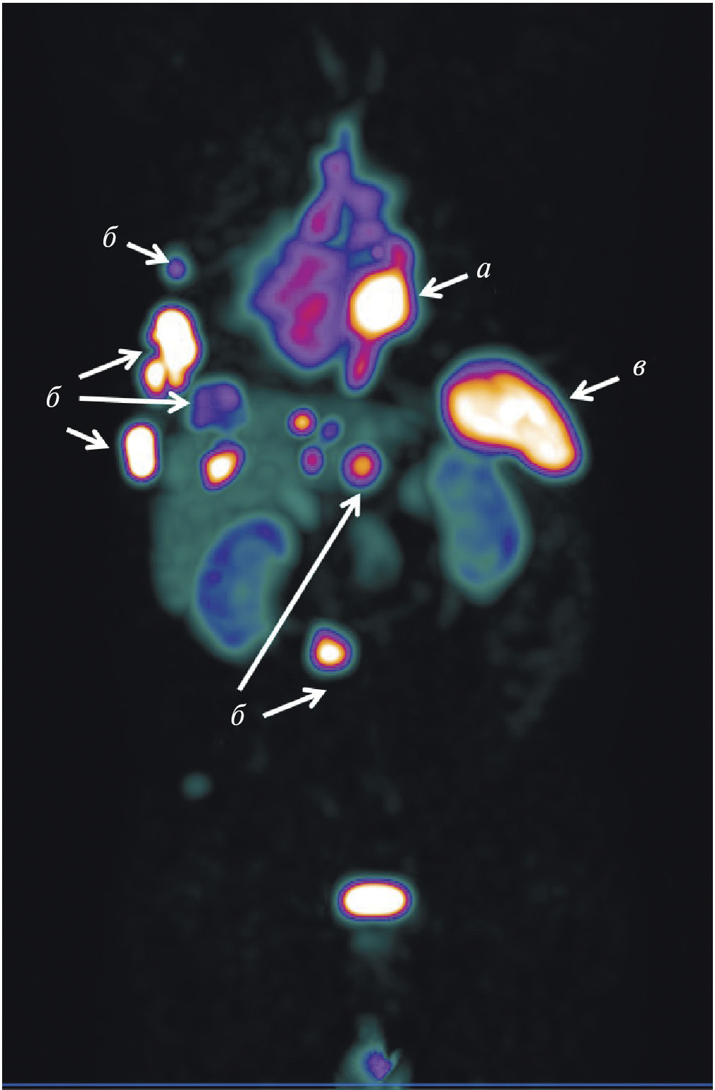 Рис. 1. ПЭТ-изображение пациентки с HER2/neu-позитивным раком молочной железы, выполненное через 5 суток после введения 89Zr-транстузумаба (a), стрелками обозначены метастазы в печень и кости [12]; ОФЭКТ-изображение пациентки с HER2/neu-позитивным раком молочной железы через 2 ч после введения 99mTc-ADAPT6 (б), стрелками обозначены первичная опухоль, метастазы в лимфатические узлы, печень и кости