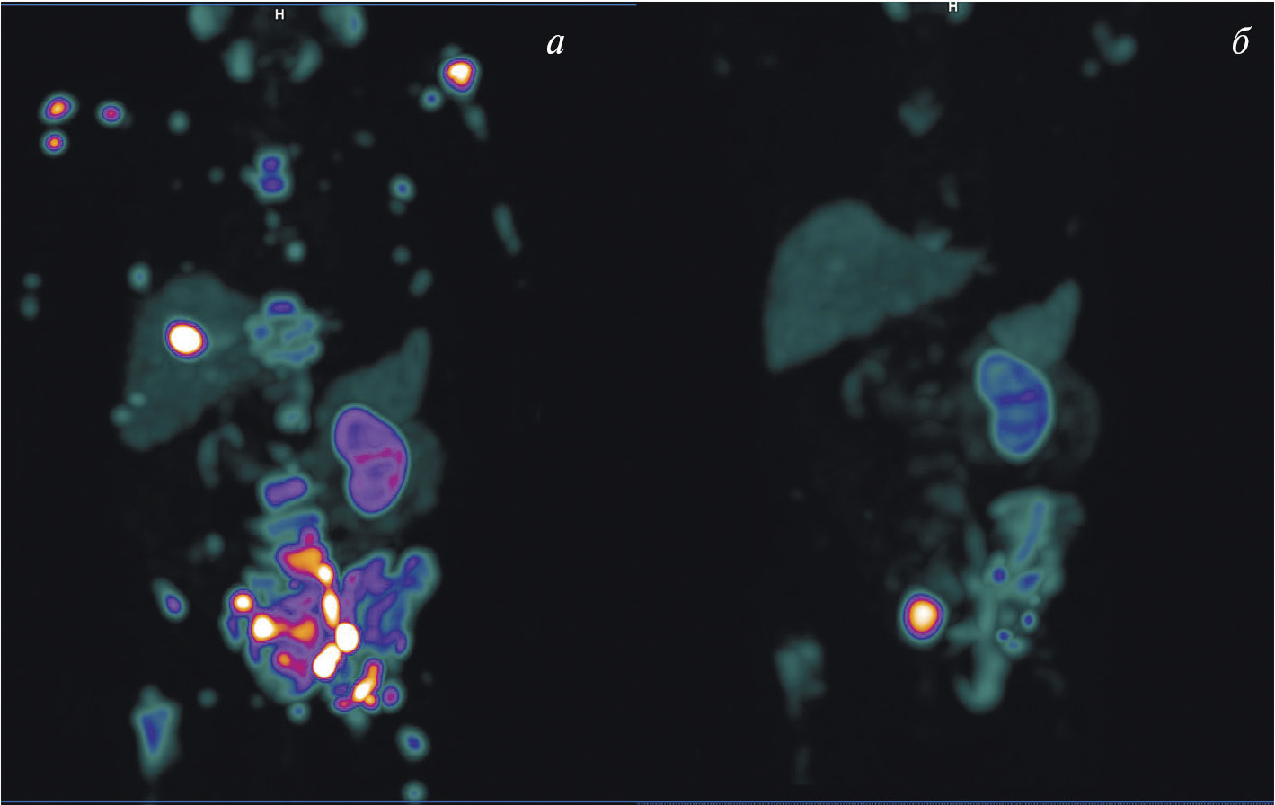 Рис. 4. ОФЭКТ с 99mТс-ПСМА пациента с раком простаты до (а) и после (б) четырёх курсов радиолигандной терапии 177Lu-ПСМА