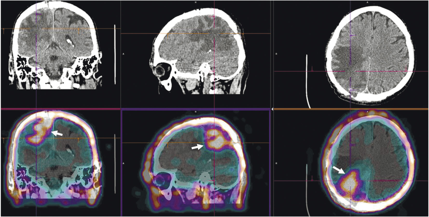 Рис. 7. ОФЭКТ/КТ с 99mTc-1-Тио-D-глюкозой пациента с рецидивом глиобластомы. Стрелками обозначено накопление РФЛП в опухоли