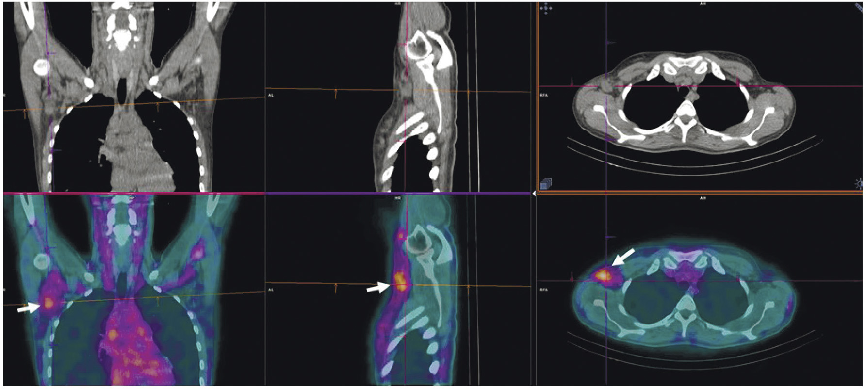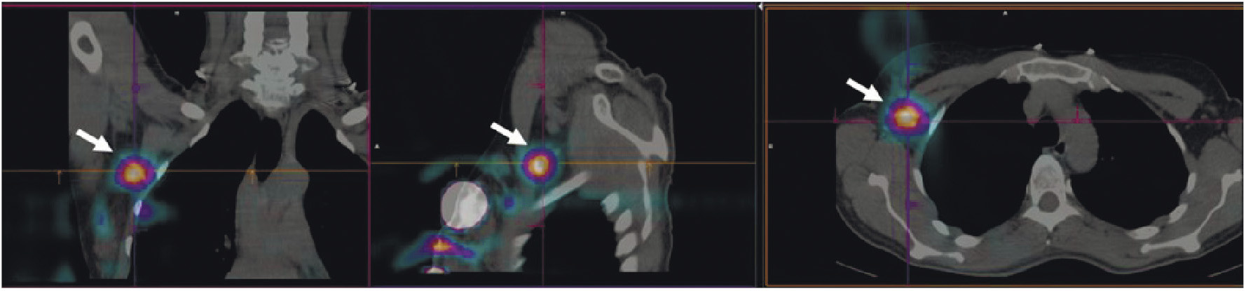 Рис. 8. ОФЭКТ/КТ с 99mTc-1-Тио-D-глюкозой пациентки с лимфомой Ходжкина. Стрелками обозначено накопление РФЛП в лимфатических узлах правой аксиллярной области
