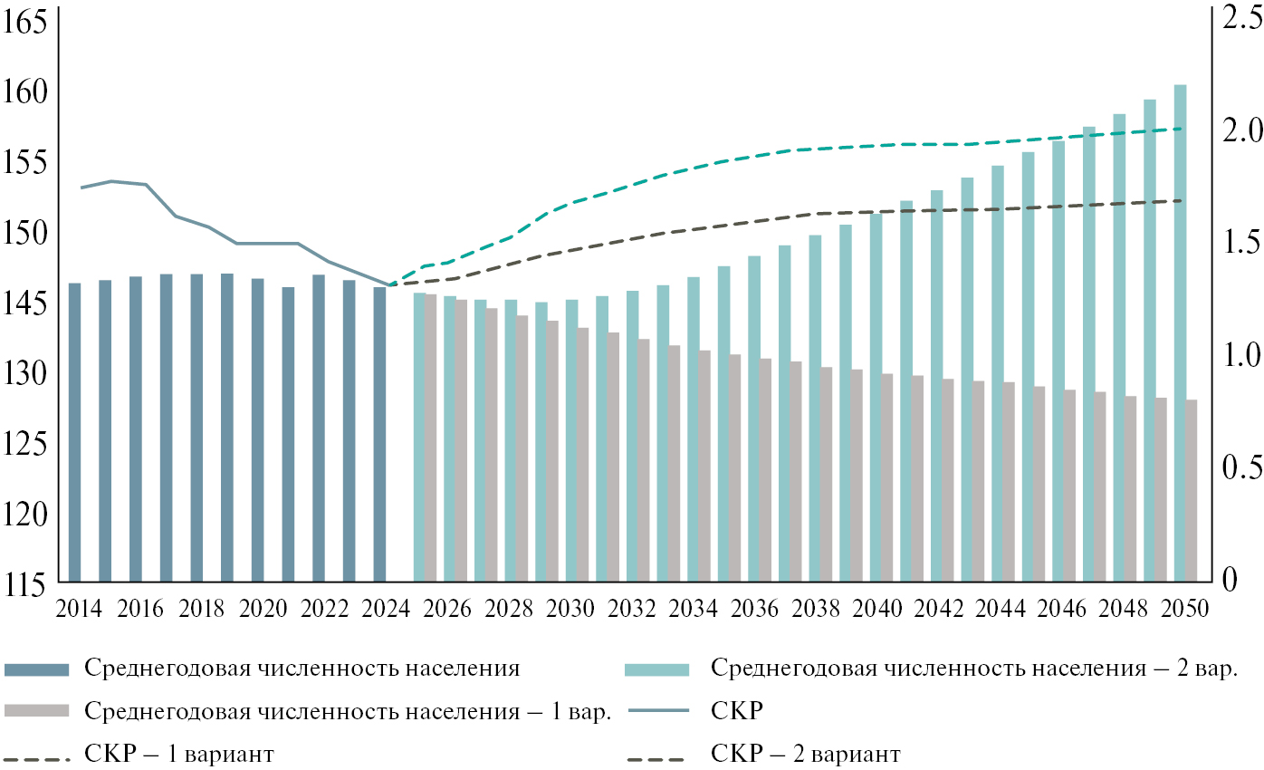 Сохранение сложившихся тенденций: относительно повышенный уровень смертности населения, суммарный коэффициент рождаемости восстановится до 1.5 (уровень 2019–2021 гг.) к 2031 г. и к 2050 г. достигнет 1.66–1.69 преимущественно за счёт высокой рождаемости мигрантов; миграционный прирост не компенсирует естественную убыль населения | Дополнительные системные меры поддержки рождаемости и семьи, суммарный коэффициент рождаемости восстановится до 1.5 к 2028 г., а к 2050 г. может достигнуть 1.9–2.0; более высокие расходы на здравоохранение позволят снизить уровень смертности до 10.0 на 1000 человек; положительный естественный прирост населения будет наблюдаться с 2033 г., общий прирост населения будет обеспечиваться не только за счёт миграции, но и во многом благодаря приросту рождаемости |