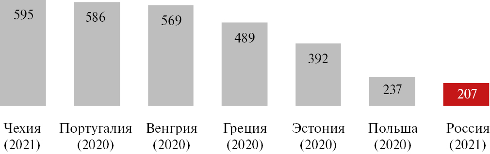 Рис. 4. Фондовооружённость работников, тыс. долл. по ППС в 2021 г.