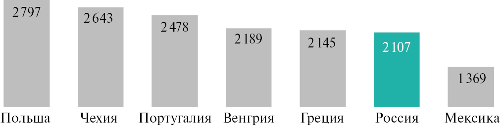 Следует отметить, что уровень зарплат в России по паритету покупательной способности (ППС) в экономике в целом примерно соответствует восточноевропейским странам, однако по уровню фондовооружённости Россия существенно отстаёт (рис. 4, 5).