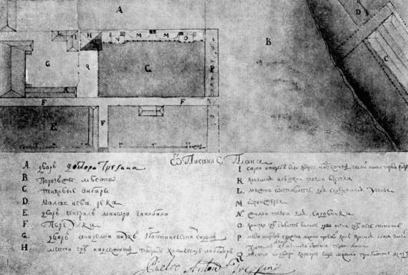 А. Двор доктора Бревена; В. Порозжее (порожнее) место; С. Пенковые амбары; D. Малая Нева река; E. Двор генерал-майора Ганибала; F. Переулки; G. Двор Академии наук и ботанических садов; H. Место, где надлежит построить химическую лабораторию; I. Сараи и погреб ветхие, которые надлежит сломать и оные перенести к литеру; К. Конюшня и людской покой ветх; L. Можно оставить для содержания уголья; М. Оранжерея; N. Жилой покой для садовника; О. Каморка, где ставить большие древа, и сени, где печь топить; Р. Место шириной 4 сажени, можно прибавить как красная линия значит против каменного строения Первой линии; Q. Место от двора, которое ещё можно прибавить к саду [9, ф. 20, оп. 3, № 31, л. 1–2]