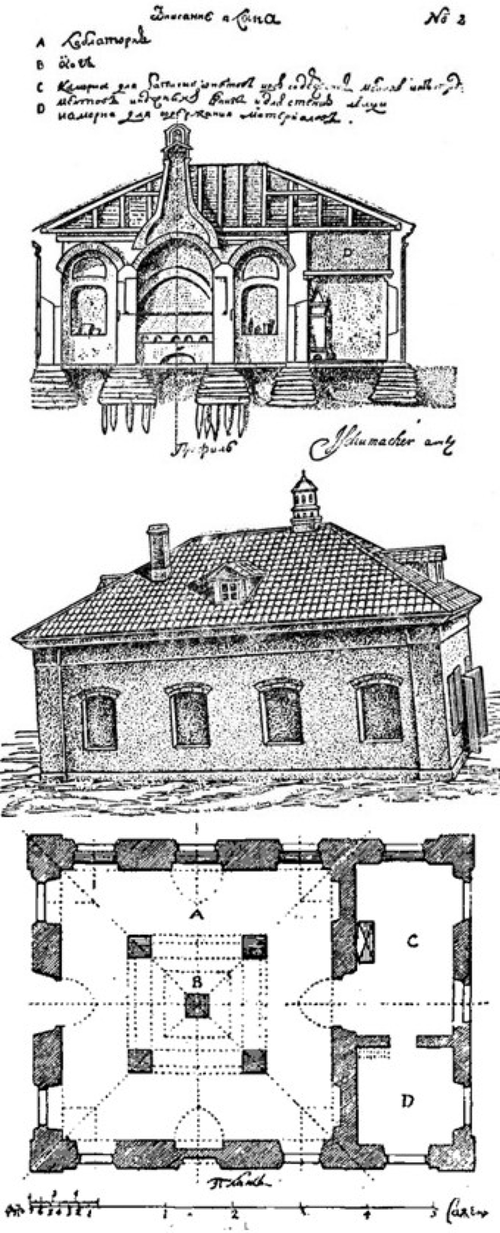 5. Рис. 3. Разрез, внешний вид и план первой в России научной химической лаборатории (чертёж архитектора И.Я. Шумахера)