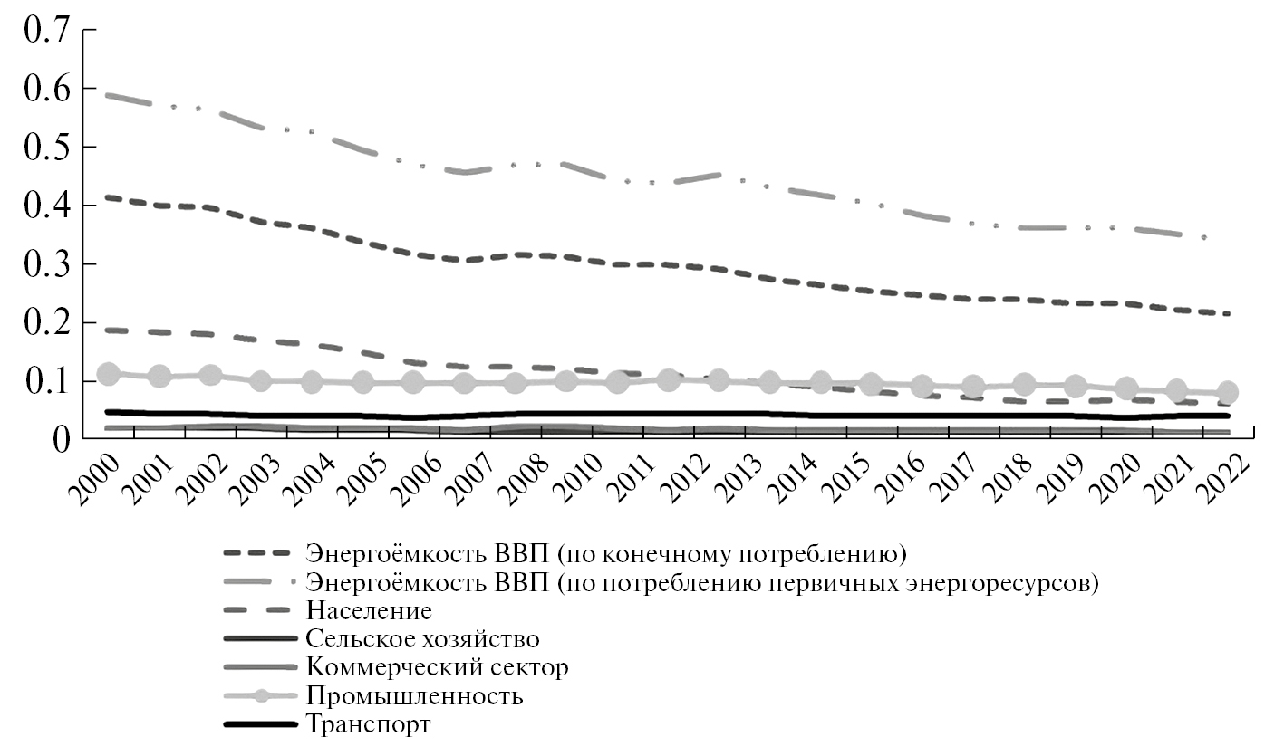 В сфере конечного потребления энергии в 2000–2022 гг. наиболее динамично росло её использование на транспорте (в 3.4 раза), в промышленности (в 2.9 раза) и сельском хозяйстве (в 2.0 раза), коммерческом секторе (в 2.6 раза), жилом секторе (в 1.3 раза).
