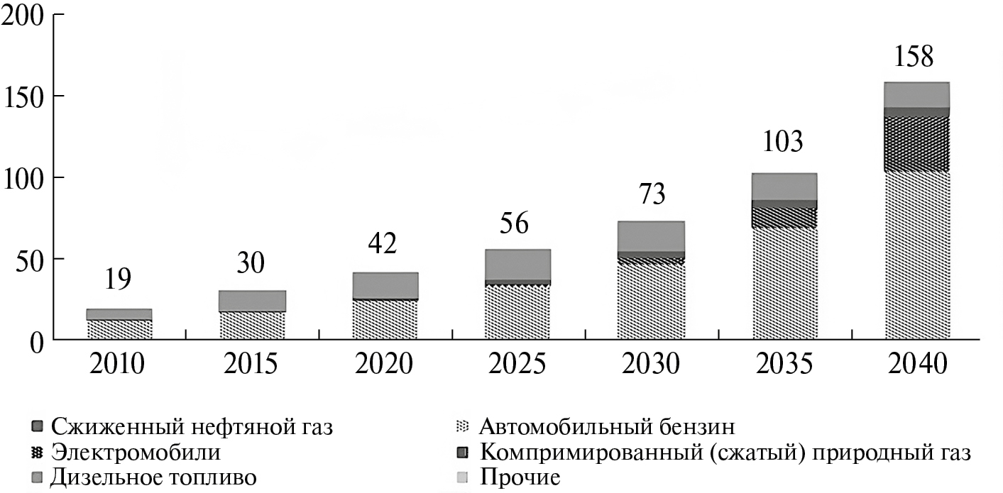 Импорт нефти. На начало 2023 г. Индия являлась третьим крупнейшим импортёром нефти в мире после Китая и США. По данным ОПЕК, её удельный вес в мировых поставках на начало 2010 г. составлял всего 6.5%, а к концу 2022 г. увеличился до 10.3% в результате повышения спроса на нефтепродукты со стороны населения и падающей добычи. По оценкам Wood Mackenzie [5], к 2040 г. добыча нефти в стране снизится на 37.4% к уровню 2020 г., до 0.5 млн барр./сут, в то время как спрос на жидкие углеводороды вырастет в 2 раза, до 9.6 млн барр./сут, по оценкам ОПЕК – в 2.2 раза, до 10.2 млн барр./сут. При этом в результате активной автомобилизации (рис. 5) наибольший спрос придётся на дизельное топливо и автомобильный бензин. Можно констатировать, что к 2040 г. внутренней добычей будет обеспечено только 5.2% (в 2010 г. – 27.1%) потребления жидких углеводородов.