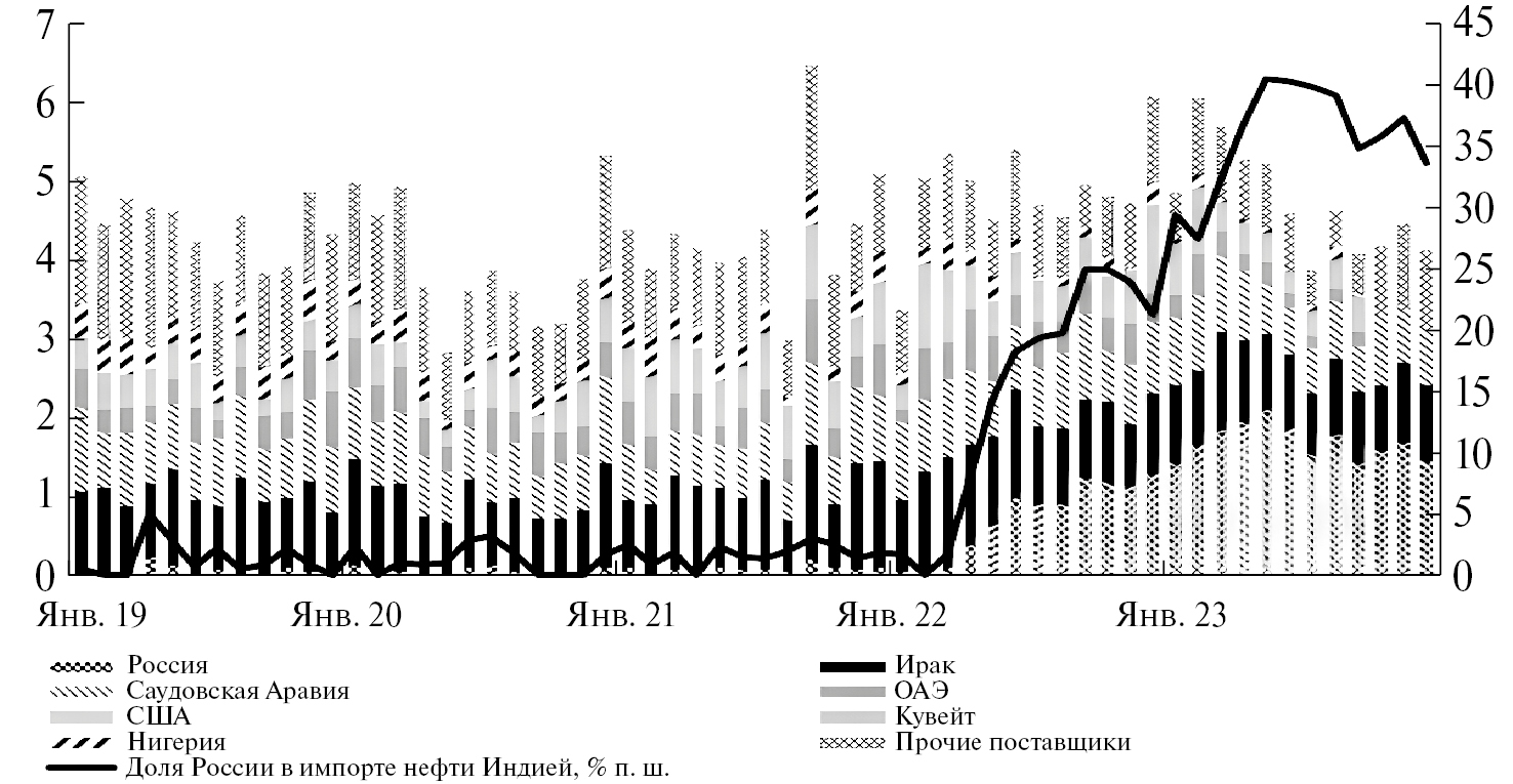4 Так, по данным Министерства нефтяной и газовой промышленности Индии, в августе 2023 г. среднемесячная импортная цена нефти из России составляла 74.5 долл./барр., что на 7.2% ниже цены иракской и на 18.7% саудовской нефти. Жидкие углеводороды из России продавались на 6.1 долл./барр. ниже средней цены.