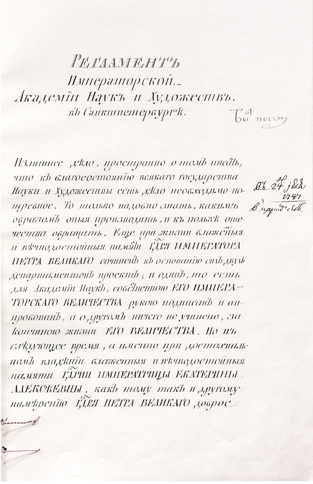 Рис. 1. “Регламент Императорской Академии наук и художеств в Санктпетербурге”. Автограф Елизаветы Петровны: “Быть по сему”. 24 июля 1747 г. в Царском Селе. © СПбФ АРАН. Р. IV. Оп. 4. Д. 2. Л. 2.