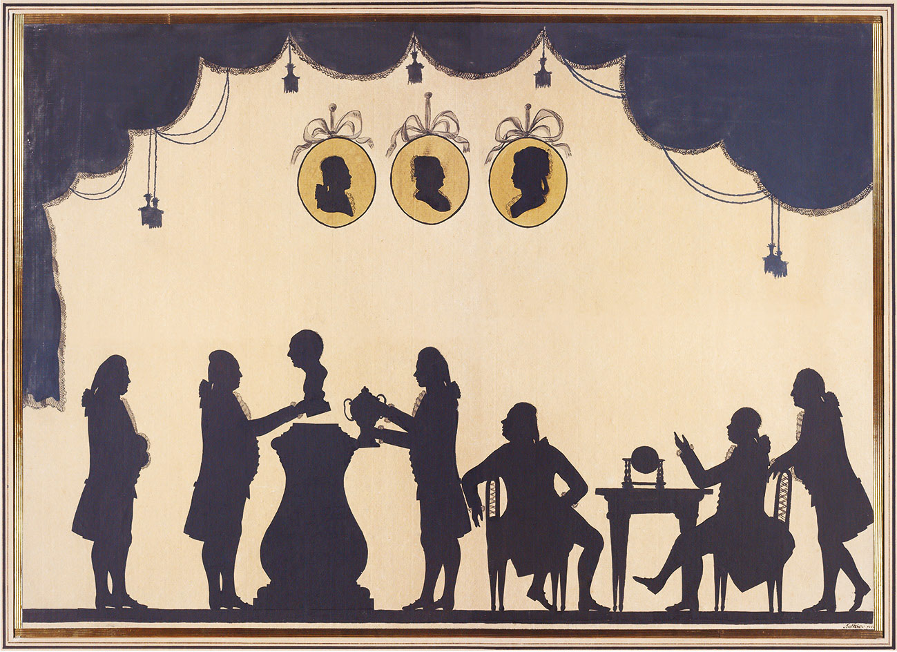 Рис. 2. Группа академиков, устанавливающих бюст Л. Эйлера. Сверху три портрета в медальонах − цесаревич Павел Петрович, императрица Екатерина II, великая княгиня Мария Федоровна (жена Павла Петровича). Силуэтная картина работы И.Ф. Антинга. 1784 г. © СПбФ АРАН. Р. XII. Оп. 2. Д. 1. Л. 1.