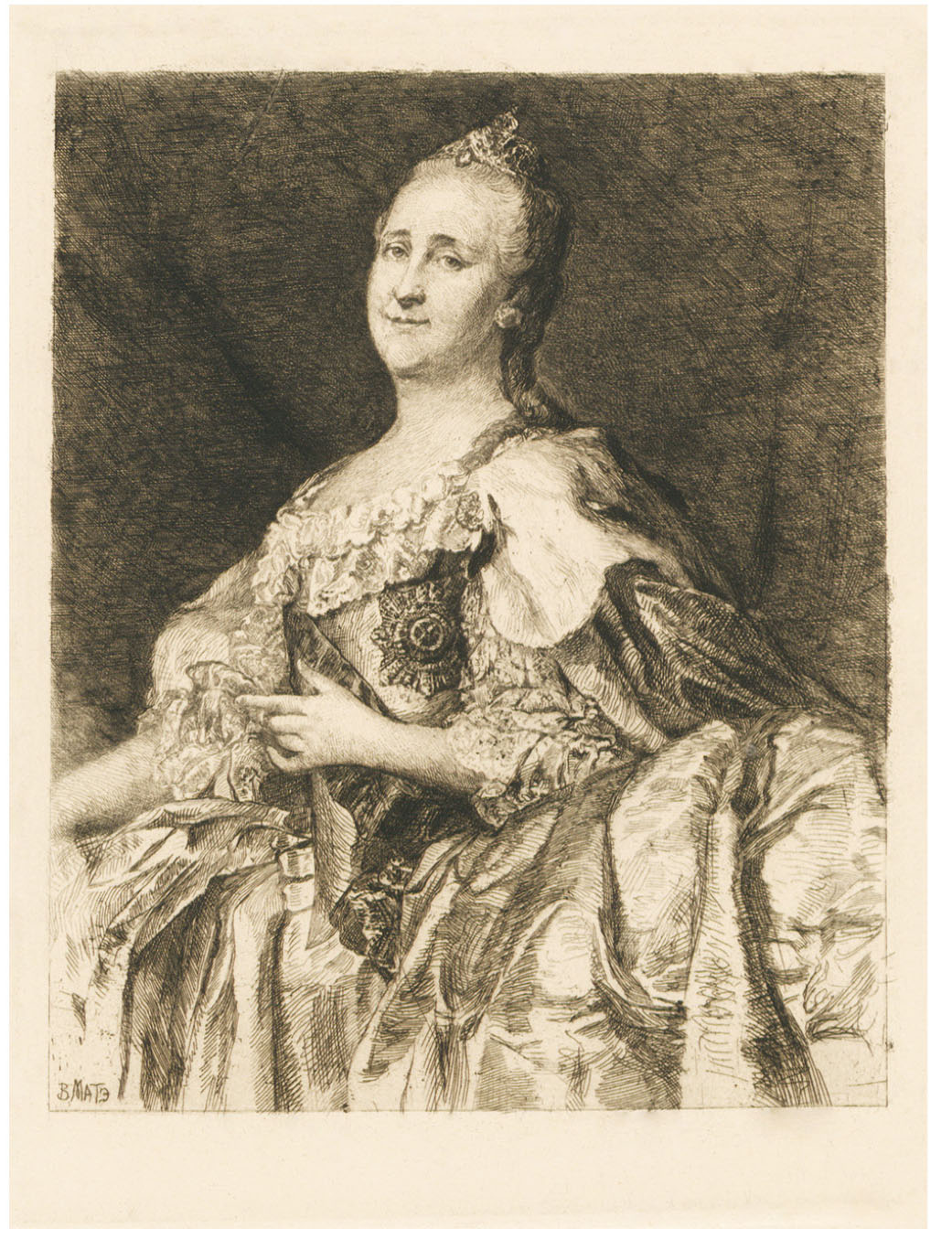 Рис. 3. Портрет Екатерины II. В.В. Матэ, с оригинала Д.Г. Левицкого 1780-х гг. Офорт, игла. 1907 г. © СПбФ АРАН. Ф. 115. Оп. 2. Д. 215. Л. 4.