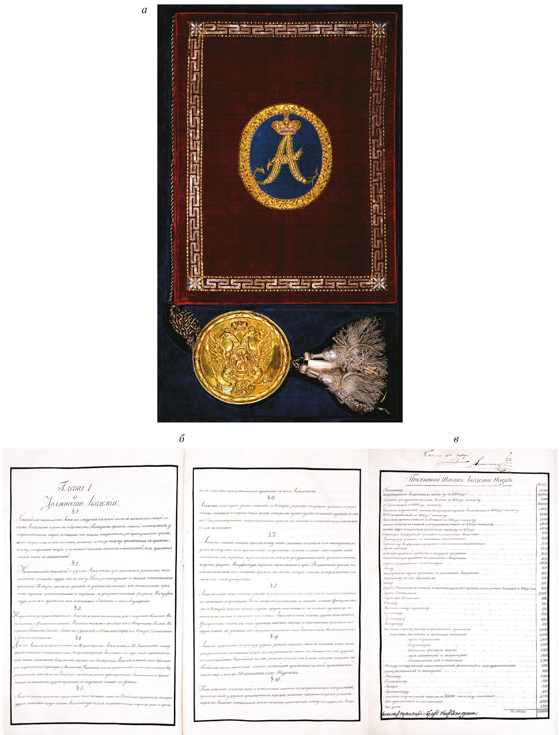 Рис. 4. Регламент и штат Императорской Академии наук а − бархатный красный переплёт с золотым и серебряным шитьём и вензелем, с государственной печатью в латунном ковчеге; б − Глава 1. “О должности Академии”; в − штат Императорской Академии наук с подписями-автографами императора Александра I, министра народного просвещения графа П.В. Завадовского. 25 июля 1803 г. Подлинник. Пергамен. © СПбФ АРАН. Р. IV. Оп. 4. Д. 4. Переплет; Л. 2 об.–3, 14 об.